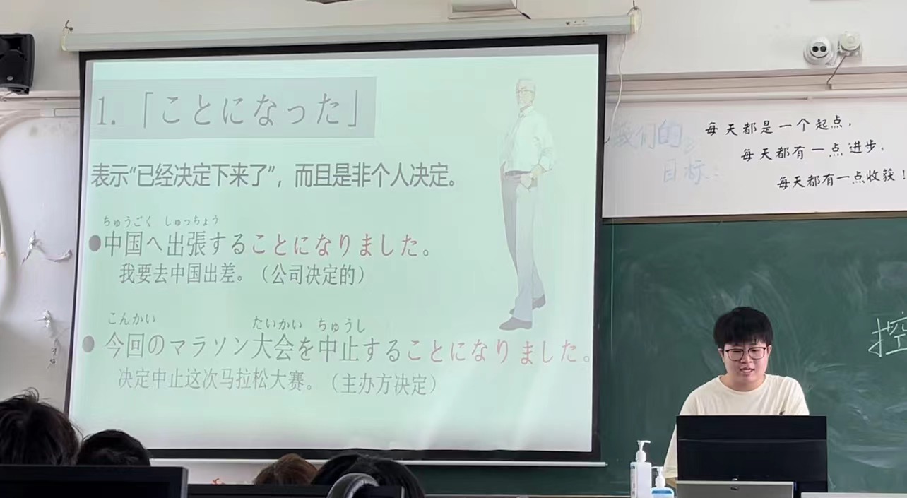 我是本次双导向课堂中主题同僚の会話(同事间的闲聊)的主讲人之一,发表的是我们小组的后半部分的内容,主要是讲解课文以及安排组员进行演绎相应的情景对话,这些也得益于我们在商务日语老师陈老师的课堂上,老师绘声绘色地为我们讲解课文,让我们以此为基础创作出了与课文相近的情景对话来为大家讲解,他更为形象的表达出了在日本职场中同事间的对话。通过本次的双导向课堂,让我受益良多。
