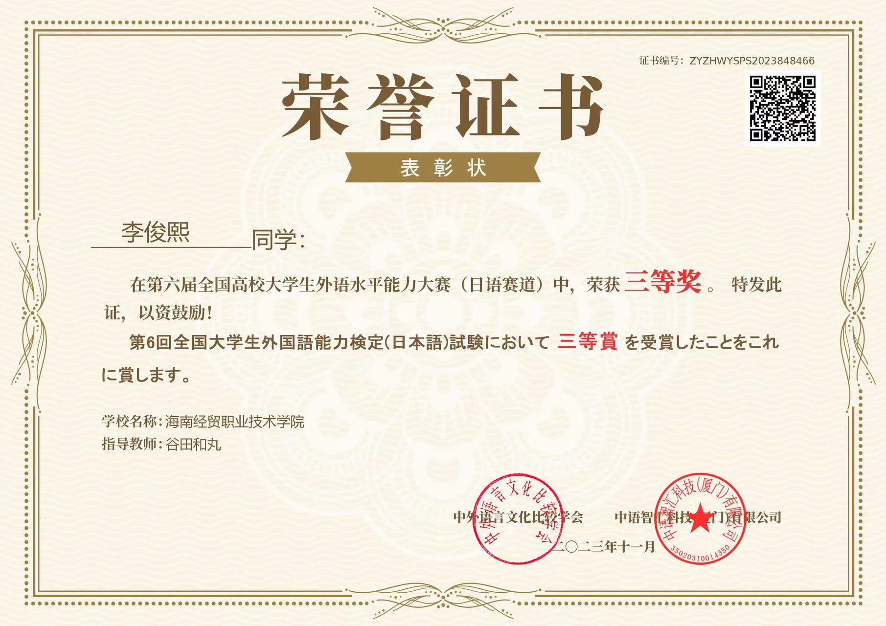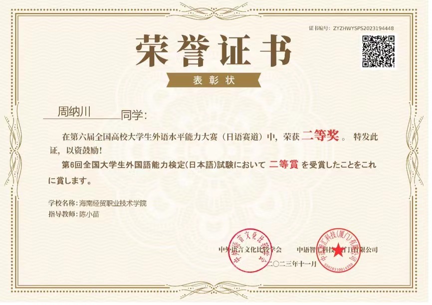 喜报:在2023年第六届全国高校大学生外语水平能力大赛中,国际教育学院应用日语专业学生周纳川,参加日语赛道比赛,获二等奖1项,指导老师陈小苗,孙婉轩、李俊熙、郭伟峰,分获三等奖3项,指导老师林由惠、谷田和丸、陈小苗。恭喜以上四位同学,以及辛苦培训的日语教师们。