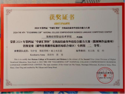 11月2日,由海南省外语职业教育教学指导委员会主办的2024“中国教育电视台•外研社杯”职场英语挑战赛(写作赛项)在海口经济学院成功举办。在我院教师凌京瑞老师的指导下,2023级商务英语3班学子陈莹凭借其出色的英语写作能力荣获海南赛区一等奖。