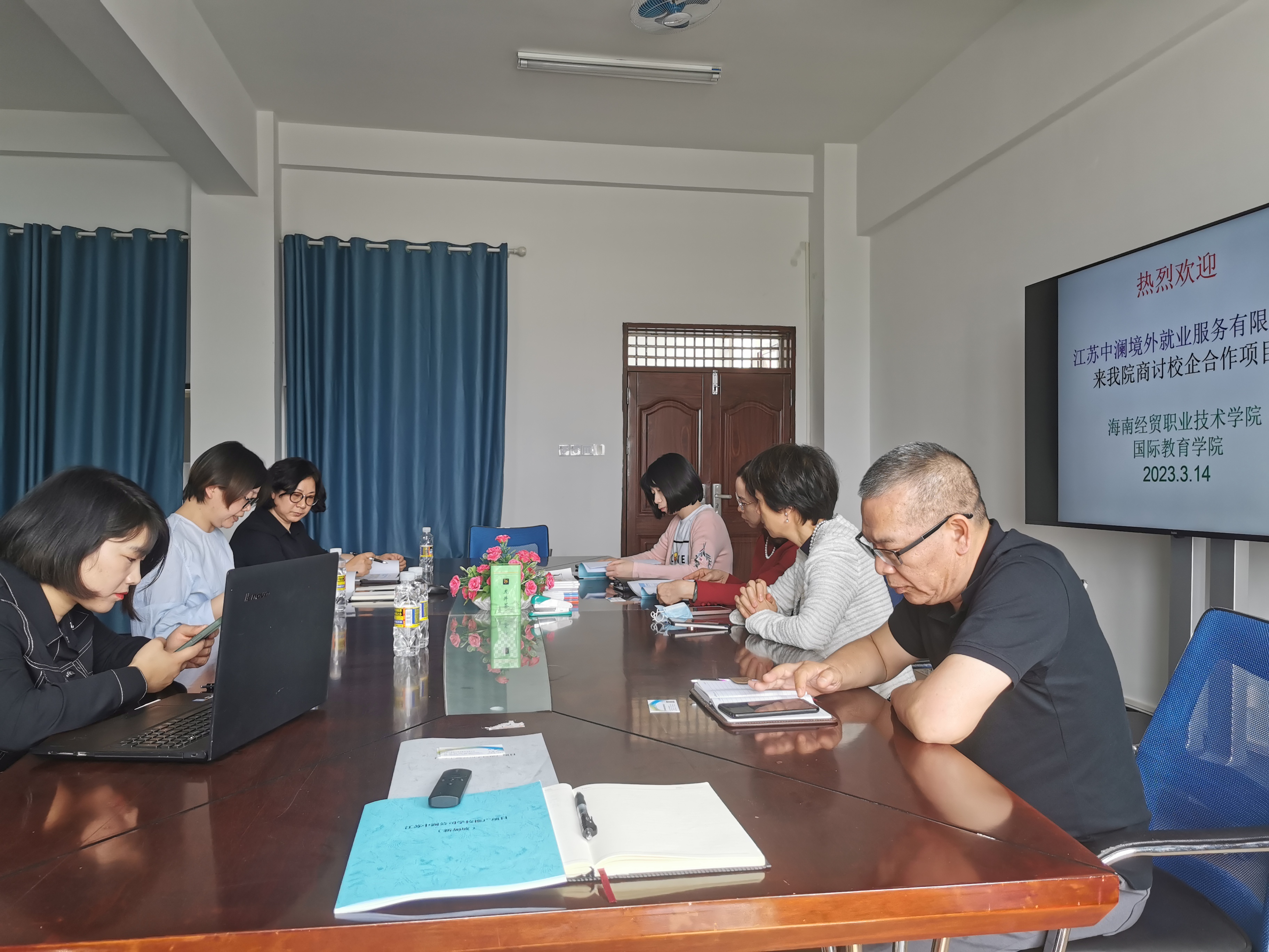 为推动产学研协同创新,寻求校企合作共赢、共谋发展的良好局面,2023年3月14日下午,江苏中澜境外就业服务有限公司徐丽经理、校企项目部经理徐群、高茜玲等一行应邀莅临我校国际教育学院座谈校企合作。国际教育学院刘莉副院长、郑艳副书记、学工办黄银亮老师、应用日语专业负责人王耀义老师和商务英语专业负责人黄桂凤老师参加了座谈会。