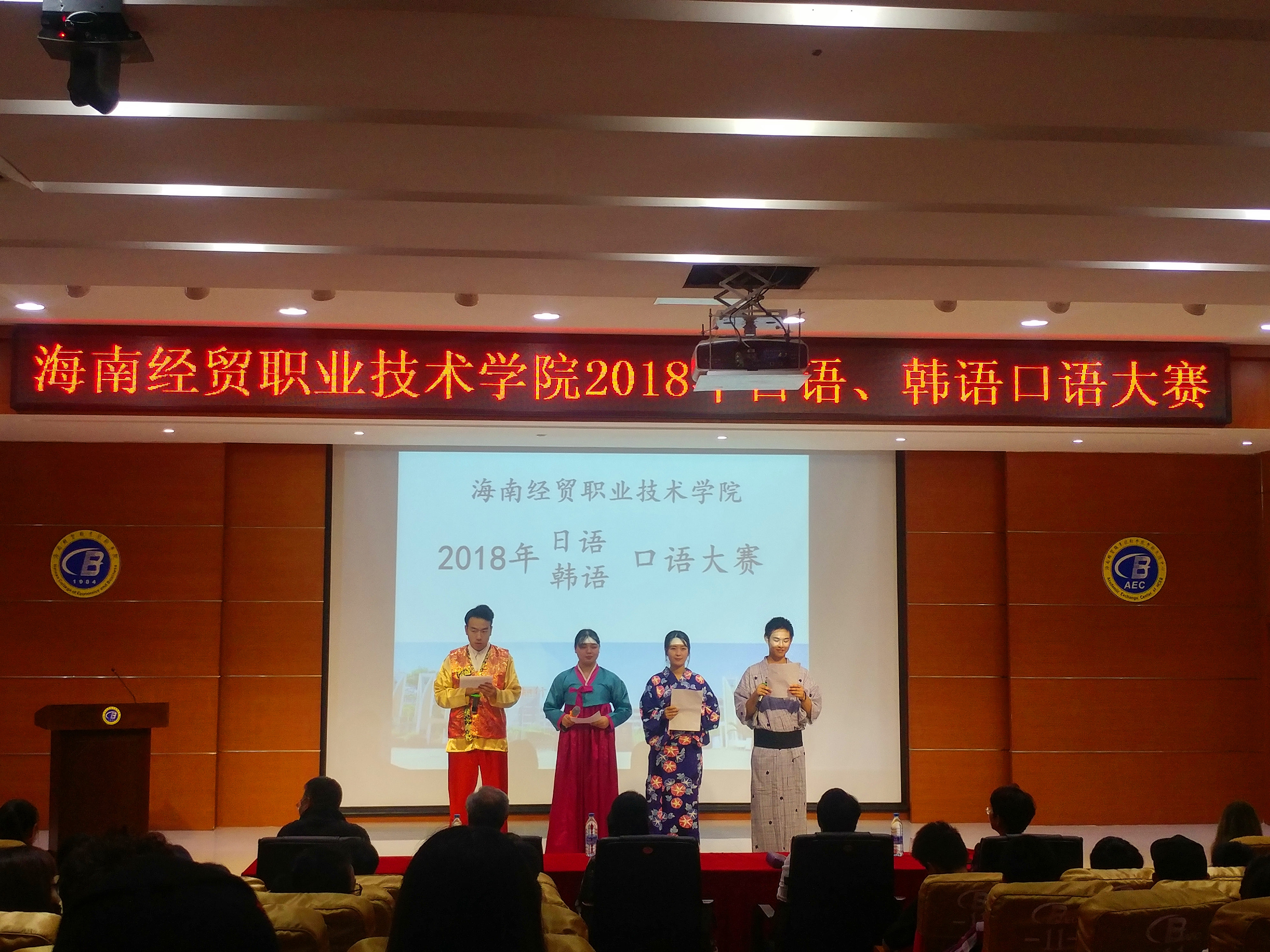 11月20日下午,我校2018年日语、韩语联合口语比赛在学术报告厅举行。本次比赛由国际教育学院应用日语和应用韩语共同承办,旨在增加我院日语和韩语专业学生学习好所学专业外语的激情,为同学们提供一个展示自己才艺,展示自己日语和韩语语言能力的舞台。