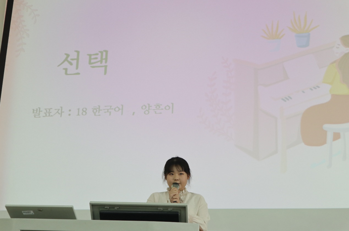 伴随着第六届韩国语口语大赛第一名获得者——18应用韩语班王璐璐学姐的歌声,拉开了此次大赛的序幕。参赛选手们从容不迫、用流利而标准的韩语进行了精彩的演讲,他们有的娓娓道来、有的热情洋溢,风采各异,表现出扎实的韩语功底、良好的韩语演讲能力,赢得了大家的一致好评。比赛最后,评委根据演讲者发音、语言、仪表仪态、临场表现等方面的综合评分,18应用韩语班符明思同学以86分的高分荣获一等奖,来自19商务英语班的羊辉同学和18应用韩语班胡彩霞同学荣获二等奖,三等奖则被杨欣怡,林芷瑶,吴琳伊四位同学收入囊中。恭喜以上获奖同学! 赛后评委对选手们的表现进行了精彩点评. 对参赛选手的精彩表现给予了充分肯定,同时指出了同学们在语音语调、语言表达等方面存在的不足,并对同学们如何提高韩语口语能力提出了宝贵建议。