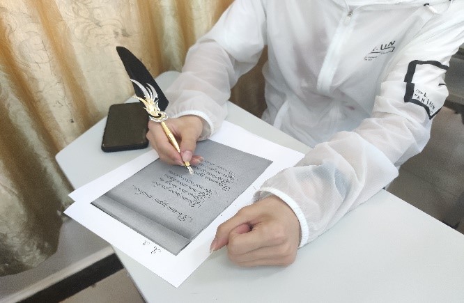 比赛流程主要有:公布比赛规则及比赛诗目、正式书写、评委评分、颁发奖品。在比赛环节,各参赛同学专注认真、全神贯注,不仅展示了书写的良好姿态,更完美展示了海经贸学生良好的精神风貌,还使用经典羽毛笔,将俄式书写习惯融入写作过程。他们洋洋洒洒、奋笔疾书,用清秀的字迹赢得了俄语教研室教师的一致赞赏,同时也将“书我之感,写其精神”的书法精神根植在心中。