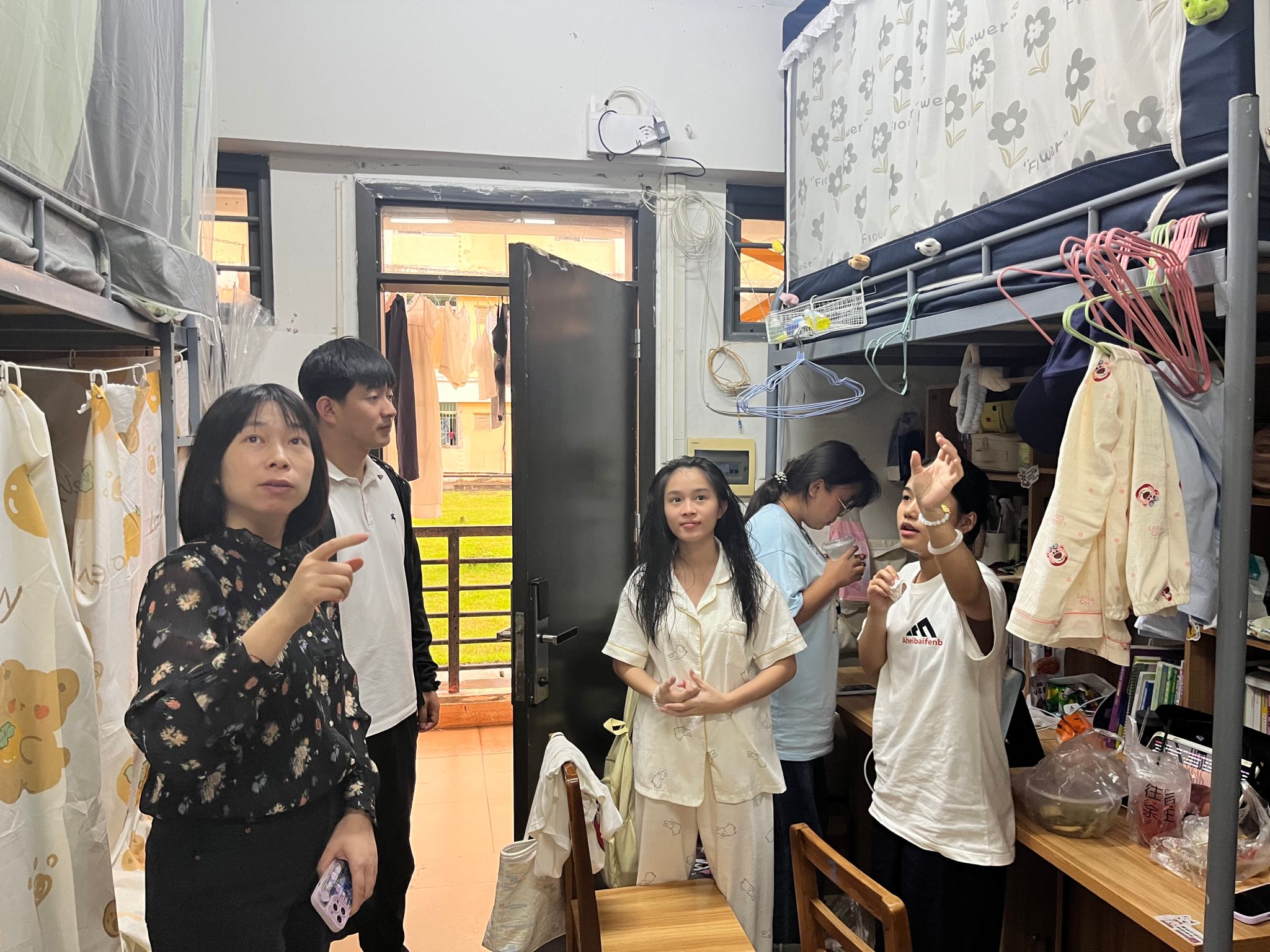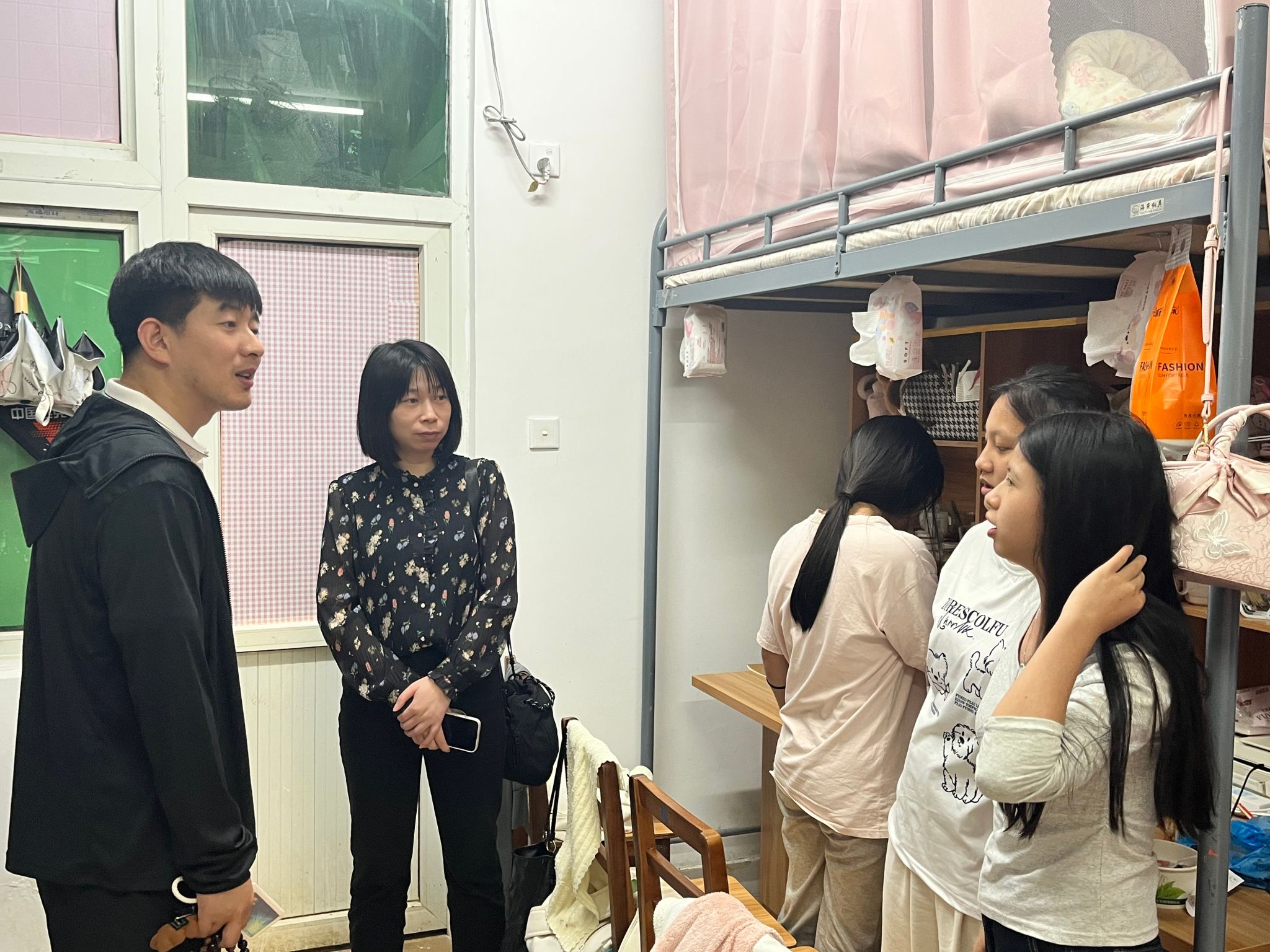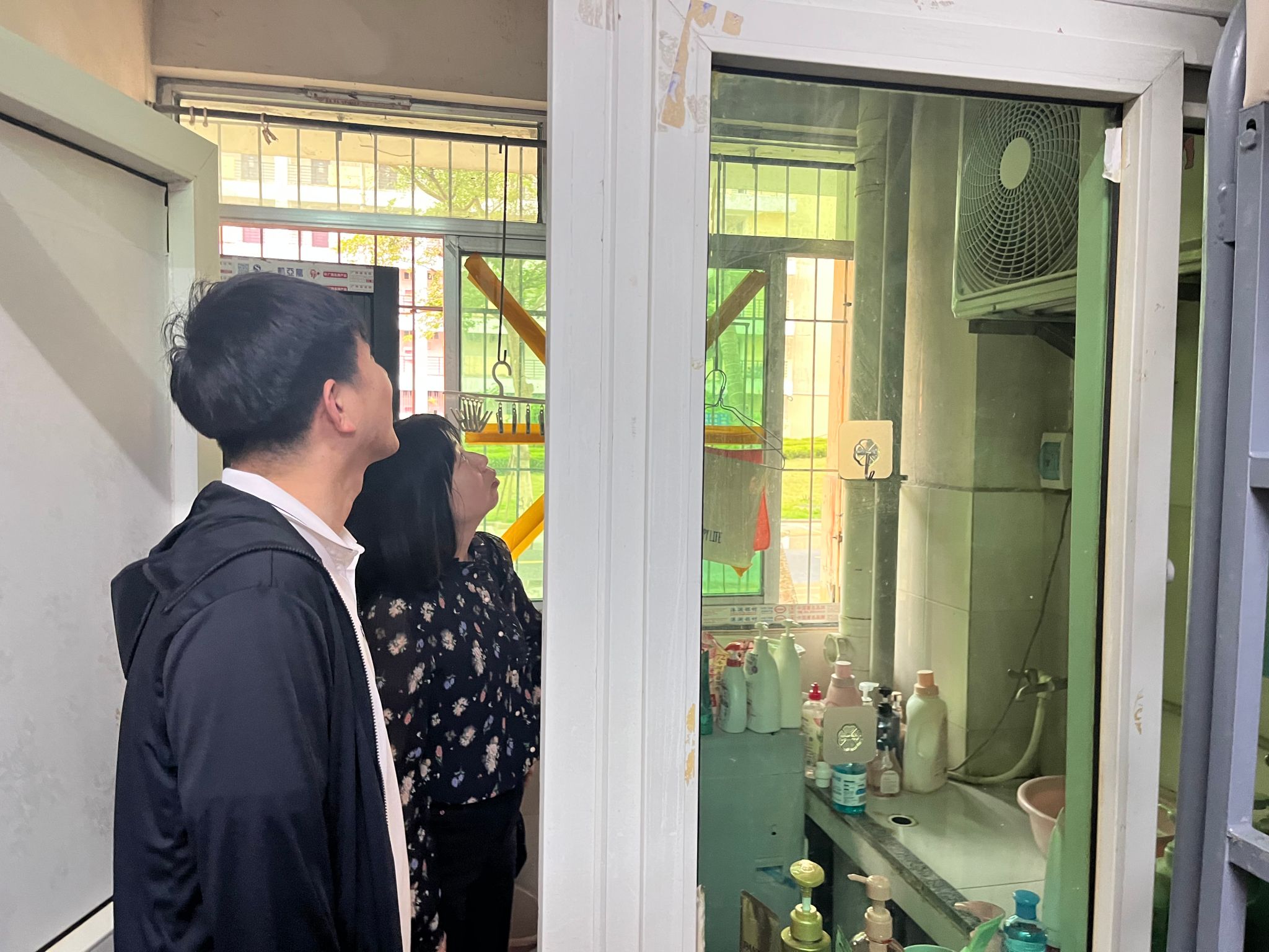 24日当晚,郑艳带队到6栋学生宿舍实地走访调查,通过“查、听、记、改”四步工作法,对于学生在座谈会提出的问题给予实际有效的解决办法,指导学生使用“后勤宝智能报修”小程序报修宿舍问题,打通服务学生“最后一米”。