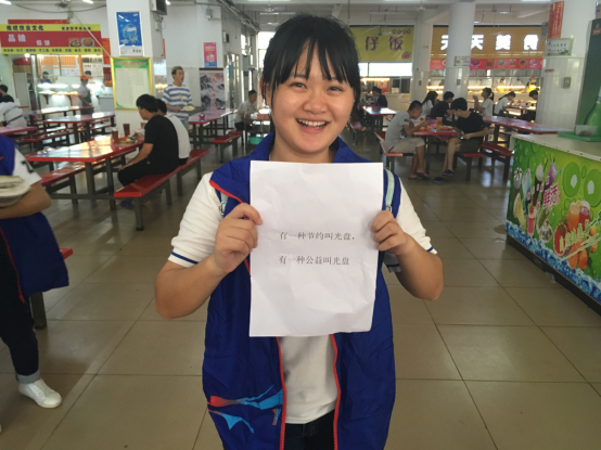 近日,媒体广泛宣传“舌尖上的浪费”,学生剩饭剩菜较多,浪费现象严重。为了提高学生们的勤俭节约意识,树立学校的良好形象、发扬中华文化的传统美德,10月11日中午,国际教育学院青年志愿者协会举办了“光盘行动,从我做起”的活动。志愿者们在食堂监督引导大家文明用餐,组织同学们有秩序站队买饭,提醒同学们吃干净饭菜,把自己的饭碗放到收餐车,以便减轻打扫卫生叔叔阿姨的负担。