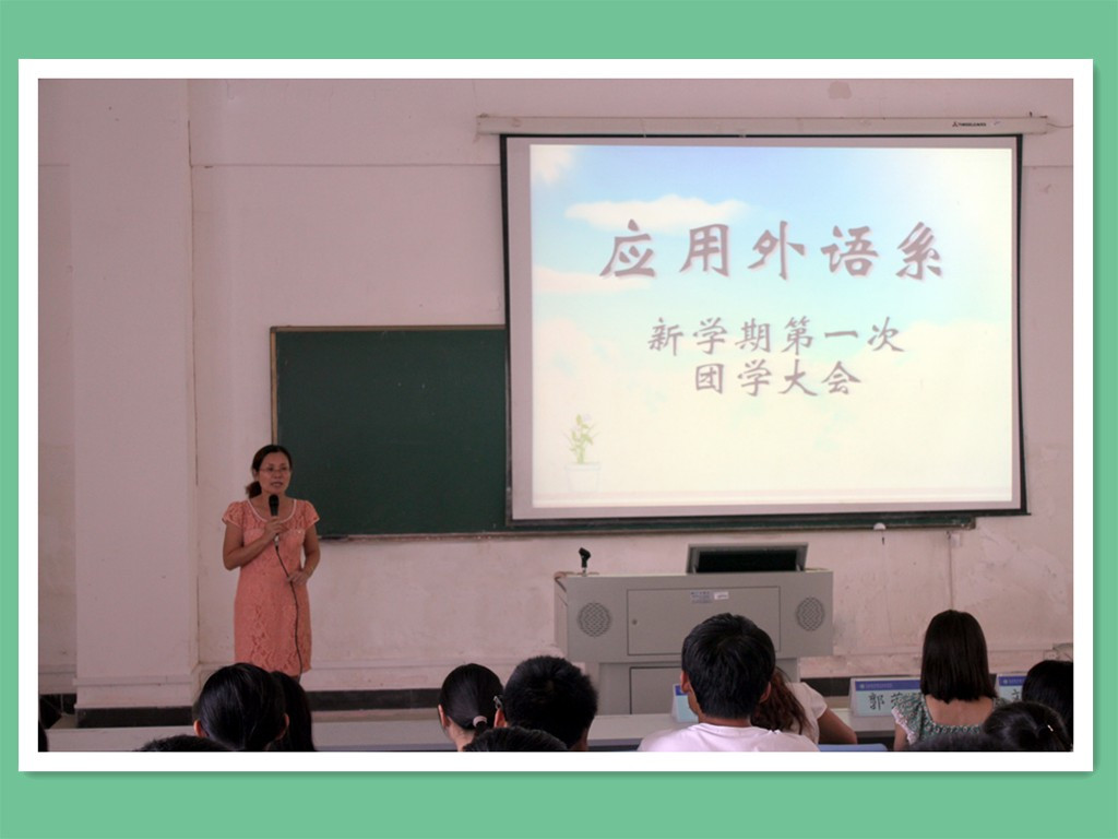 2014年10月17日中午12点,2138CC太阳集团应用外语系在教学楼1--103隆重举行了“应用外语系新学期首次团学大会”,出席本次大会的有应用外语系党总支书记朱琳,系团总支书记郭蓉佳,系就业干事李转风,系实习辅导员刘羿显,以及团总支学生会各部门的学生干部。