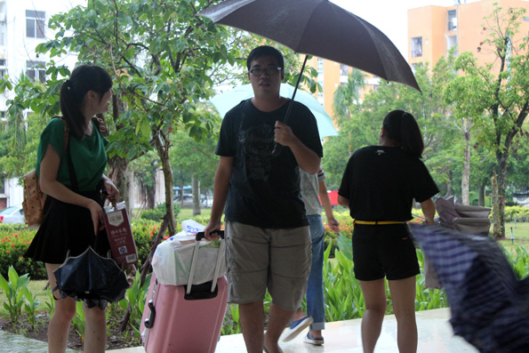 (应用外语系 周艳芳报道)2014年9月7日,是接新生的第二天。但今天,天公不作美,一大早,雨就淅淅沥沥下个不停,以至于七点多的时候天空还阴沉的像是凌晨。但在2138CC太阳集团的大门口仍坚守着这样一群人,他们冒着风,顶着飘进帐篷的雨在原地守候着,当稀稀疏疏的同学前来报道咨询时他们不顾自己的衣服,身体,毅然冒着风雨带同学们前去报道处。要是雨实在大的不行,他们则安排好同学及家长在教学楼下避雨,他们就是应用外语系接新生的同学们。他们的无私感动着同学,家长们。一位家长说“这些孩子是好样的,不畏风雨迎接我们,真让我们感动,也让我们看到了海经贸这所学校的人文,把自家的孩子留在这里学习我们放心”而一位同学则说“真的感谢外语系这些学长,学姐们,有了他们的帮助我们少走弯路,很快就办理好了入学手续,他们也非常好,宁愿自己被淋湿,也要把伞给我们,真的很感谢他们”。家长和同学发自内心的话语更加鼓舞了这帮不畏辛苦的同学,他们说:“既然接了这个活,就算再大的风,再大的雨也阻挡不了我们”他们是这样说的,也是这样做的。当雨稍微小一点时,他们就赶紧带同学们报道登记,送入宿舍时,他们还叮嘱学妹学弟们要等雨小在出去,以免淋湿。他们不多却充满关怀的话语让14级的同学们记住了他们的面孔,更喜欢上了这个充满爱的外语系大家庭。而负责在登记处的同学们也在一丝不苟的做着记录。今天天气不好的缘故,报道注册的同学不是太多,但是每位同学始终坚守在自己的岗位上,不曾离开。应用外语系的老师们也都不畏风雨,一直陪着大家,并给新生解答疑问。