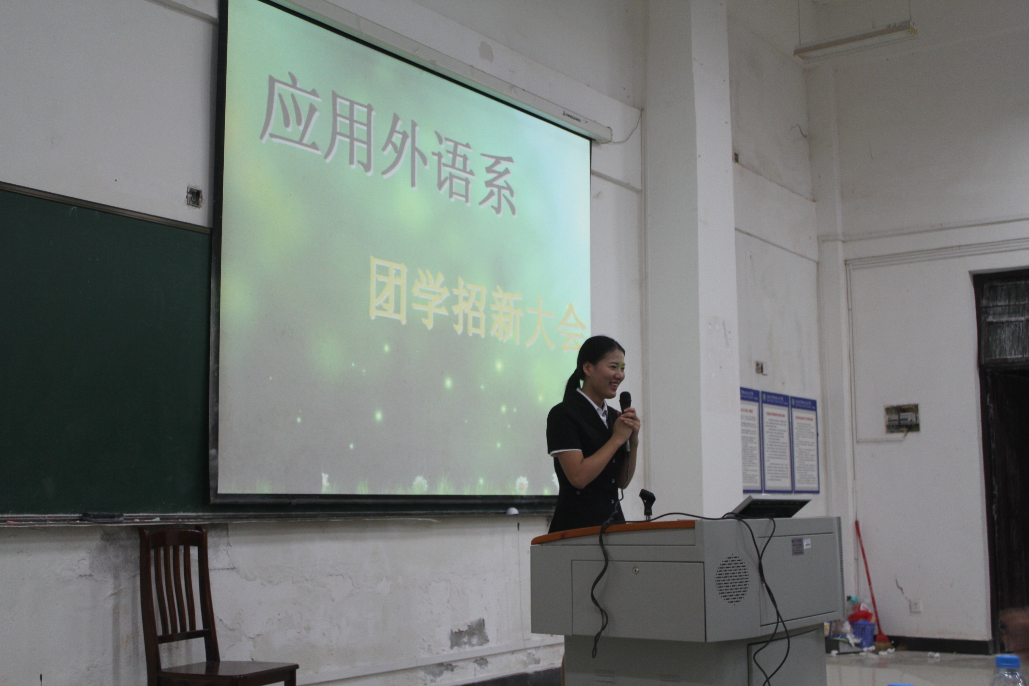 大学的学生会是一个人人向往的组织,它是一个学生自我管理,自我监督的团体。而2014年9月25日晚7:30在1-103教室,应用外语系就举行了一年一度的团学招新晚会!出席此次活动的有应用外语系团总支书记郭蓉佳老师,实习辅导员刘奕显,13级团学干部和14级全体同学!大会开始时,先由学生会主席张浩源为大家介绍了团学的组成是由学生会和社团部组成!接下来,就是团学各部长介绍自己的部门,当团总支副书记郭瑞鹏发言时,他说:“大学不像高中,大学不是人生的前奏,大学就是人生。”得到同学们的强烈共鸣。而社团部部长则给同学们说,只要有能力,有责任感,大学里到处都有你展示的平台!也得到大家的一致认同。团学介绍完毕后,是展示系服的时候。应用外语系的系服不仅代表了外语系这个团体,它更代表了应用外语系做事认真、严谨的风格!这套服装得到了很多同学的好评。会议结束时,同学们纷纷拿入团学的表,那份踊跃显示出了新一代青年的热情和勇敢。在此,祝愿14级团学招新取得圆满的成功,也祝愿同学们都能进入自己理想的部门。迈出第一步,展现完美人生。