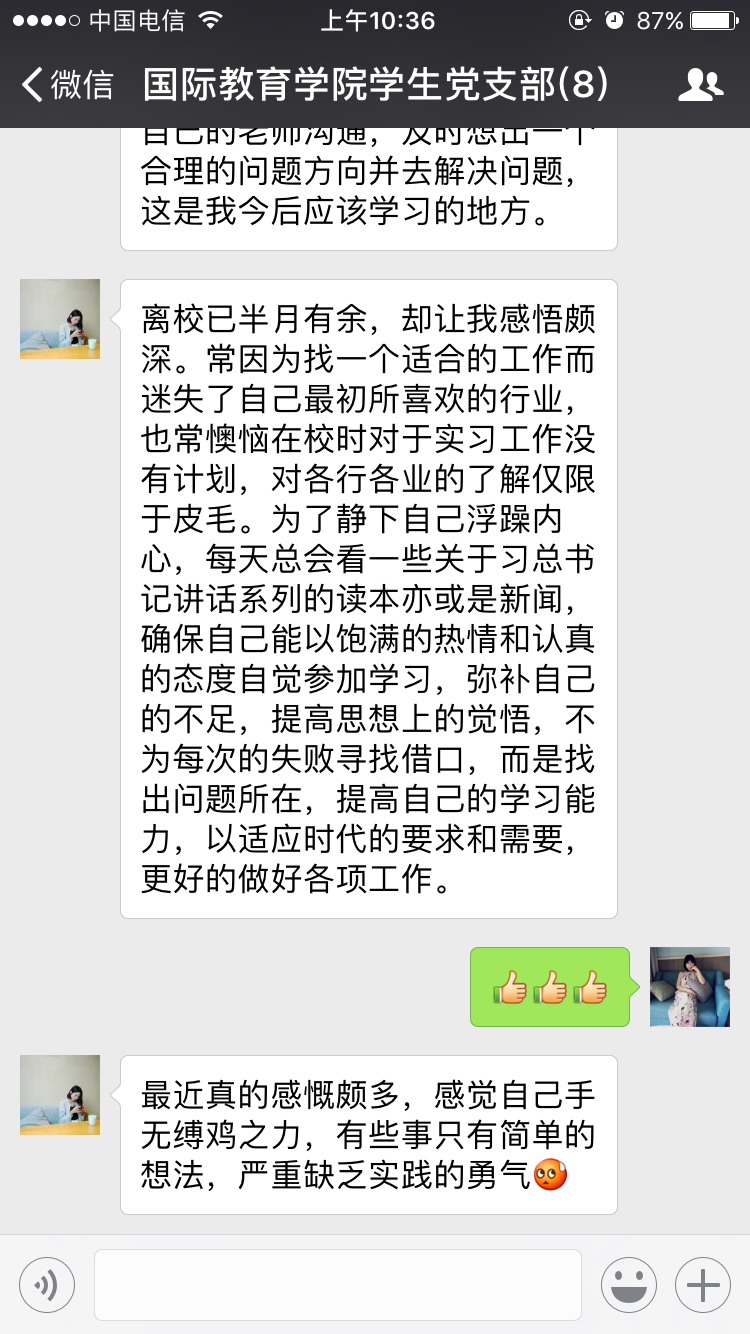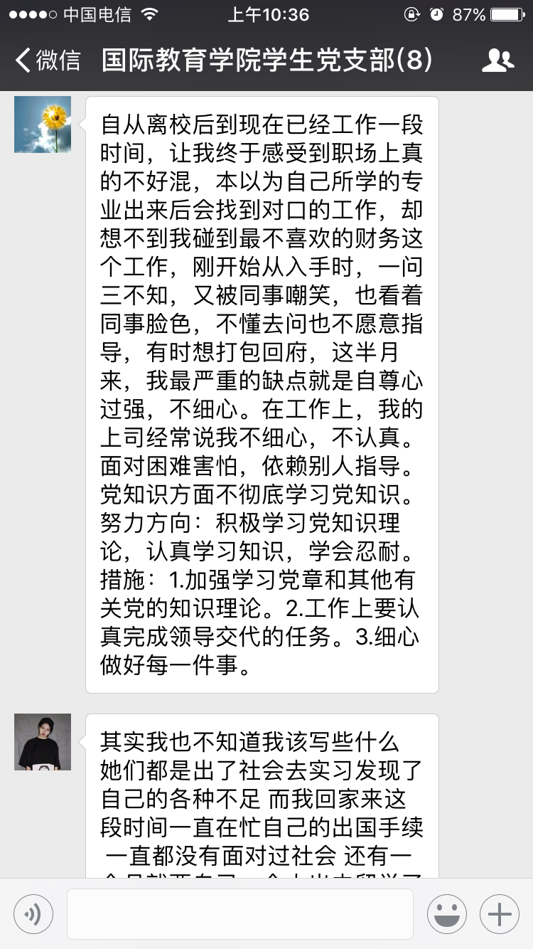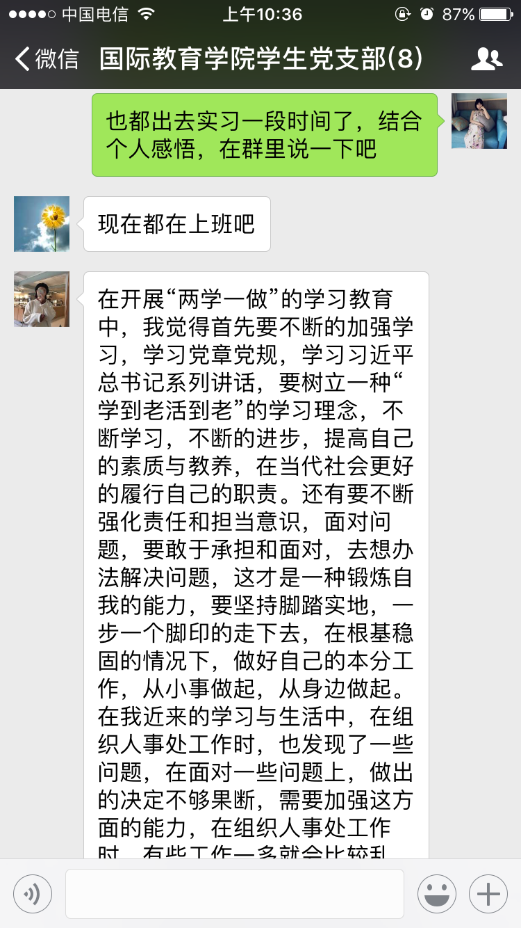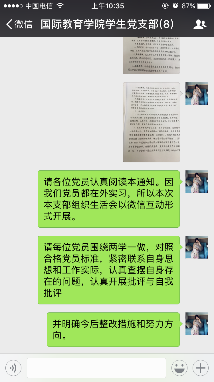 2017年11月30日,结合学生党支部学生党员都在外实习的实际情况,学生支部书记郑艳在国际教育学院学生党支部微信群主持召开全体党员大会。会议内容主要有三项:第一,传达学校《中共2138CC太阳集团委员会关于深入学习宣传贯彻党的十九大精神的通知》文件精神和内容,要求各党员认真学习十九大精神,做好学习笔记,撰写学习十九大精神的专题思想汇报; 第二,每个党员根据会前准备的专题组织生活会发言提纲,围绕“两学一做”,对照合格党员标准,紧密联系自身思想和工作实际,认真查摆自身存在的问题,认真开展批评与自我批评,并明确今后的整改措施和努力方向。第三,采取无记名投票方式,对所有党员进行民主测评。