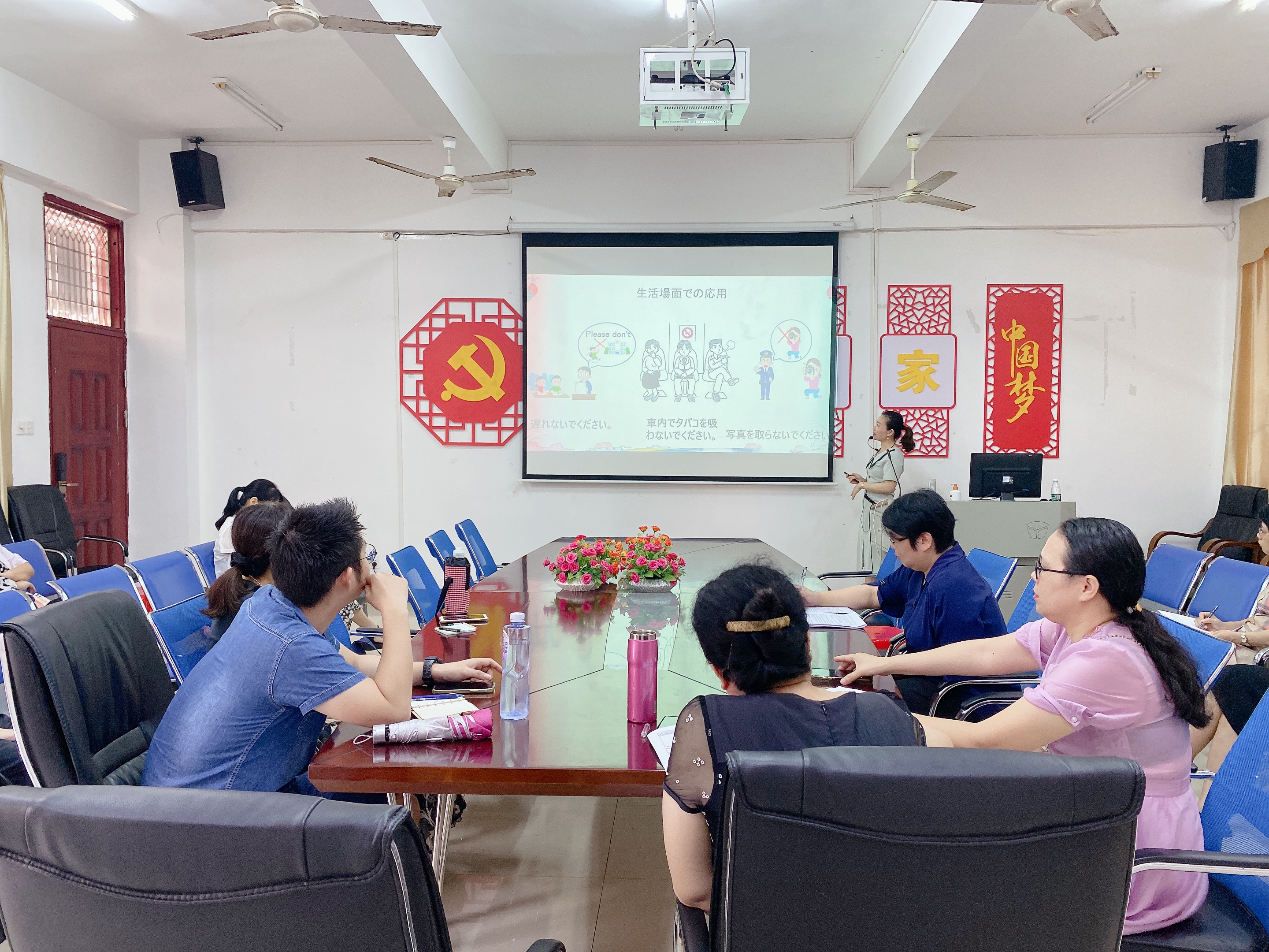 2022年6月14日,1-323教室,我院第十二届海南省高校青年教师省赛选手陈小苗老师练赛课展示。参加听评课的老师有:学校教学质量管理中心督导杨蕾达教授、国际教育学院副院长黎瑛副教授、应用日语专业全体教师和本年度新进教师。