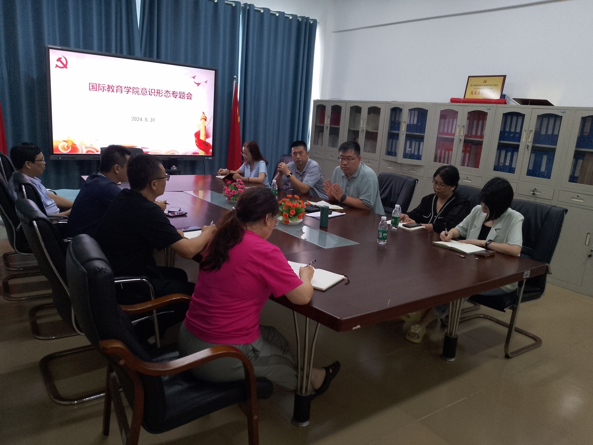 2024年5月31日,国际学院领导班子及学工办、教务办、党政办主任、全体辅导员在5-405会议室举行了意识形态专题会议。本次会议旨在就国际教育学院当前面临的多项重要议题进行深入讨论,包括考勤管理、请假制度、学生奖学金发放、教师比赛、学生技能比赛奖金发放、师德师风建设、突发事件管理、就业形式、毕业证发放、毕业典礼安排、灵活就业,以及专业负责人人选、品牌专业与特色专业建设等。