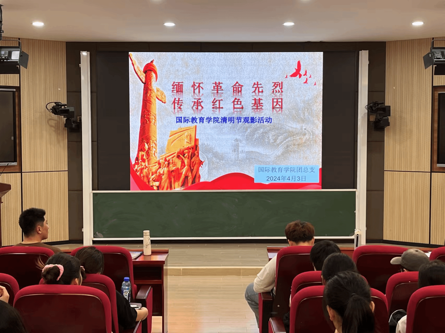 2024年4月3日下午,正值清明节来临之际,国际教育学院在这个特殊的日子里,于1-421教室举办了一场别具意义的爱国主义观影活动。本次活动由国际教育学院团总支负责人孔凯带领全体团学青干部和入党积极分子共同参与,旨在通过观影的方式缅怀革命先烈,传承红色基因。