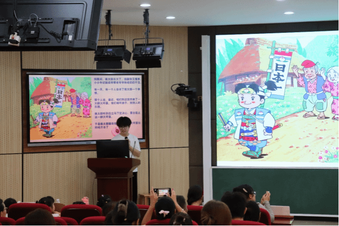 在“外国经典童话分享”环节,外国语学院学予以多语种童话回应童声,展现语言与文化碰撞的魅力:日语专业郭伟峰演绎《桃太郎》,诠释东方“仁勇智”精神;英语专业李嘉欣娓娓道来《小王子》,以诗意语言叩击“爱与责任”的真谛;韩语专业张慧通过《太阳和月亮的传说》,解析光明与黑暗的东方智慧。大朋友的耐心讲解和小朋友的纯真回答相映成趣,现场笑声与掌声交织,构建起“幼教启智,大学润心”的双向赋能生态。
