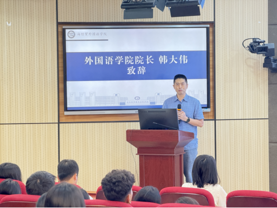 外国语学院院长韩大伟向全体新生表示热烈的欢迎和诚挚的祝贺,并以“适应、交友、协作”三个关键词寄语新生们要积极转变学习思想,主动适应大学课堂,真诚交友珍惜缘分,学会倾听尊重他人,发挥优势互相配合,在未来的学习生活中,绽放自己的青春光芒。