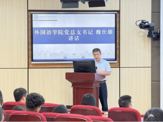 外国语学院党总支书记魏仕雄对新生们提出三点希望,一是要明确学业目标,注重社会实践积累;二是要自主学习探索,合理分配学习时间;三是要培养良好品格,保持健康生活方式,做一名有道德感、有责任感的新时代大学生。