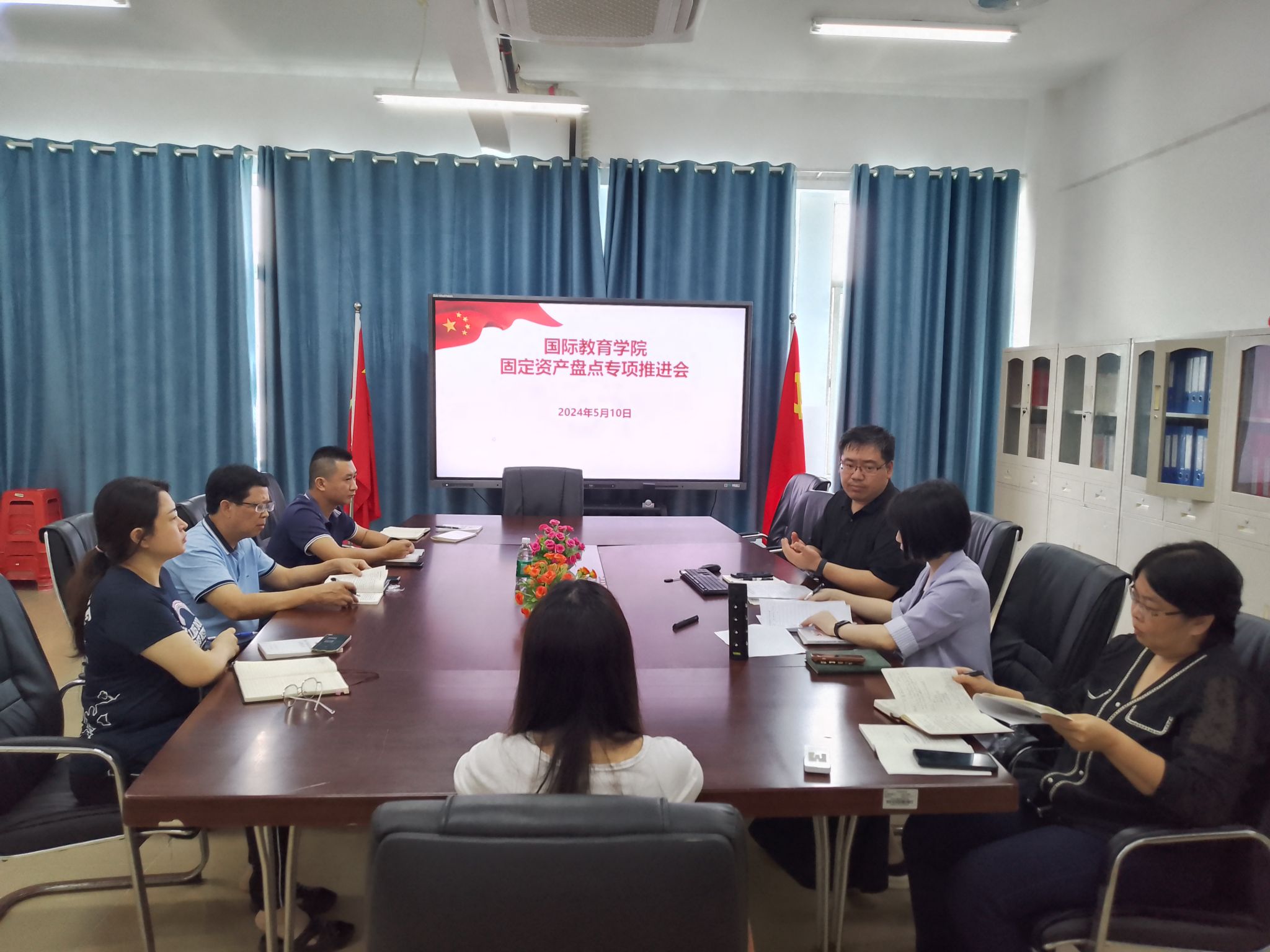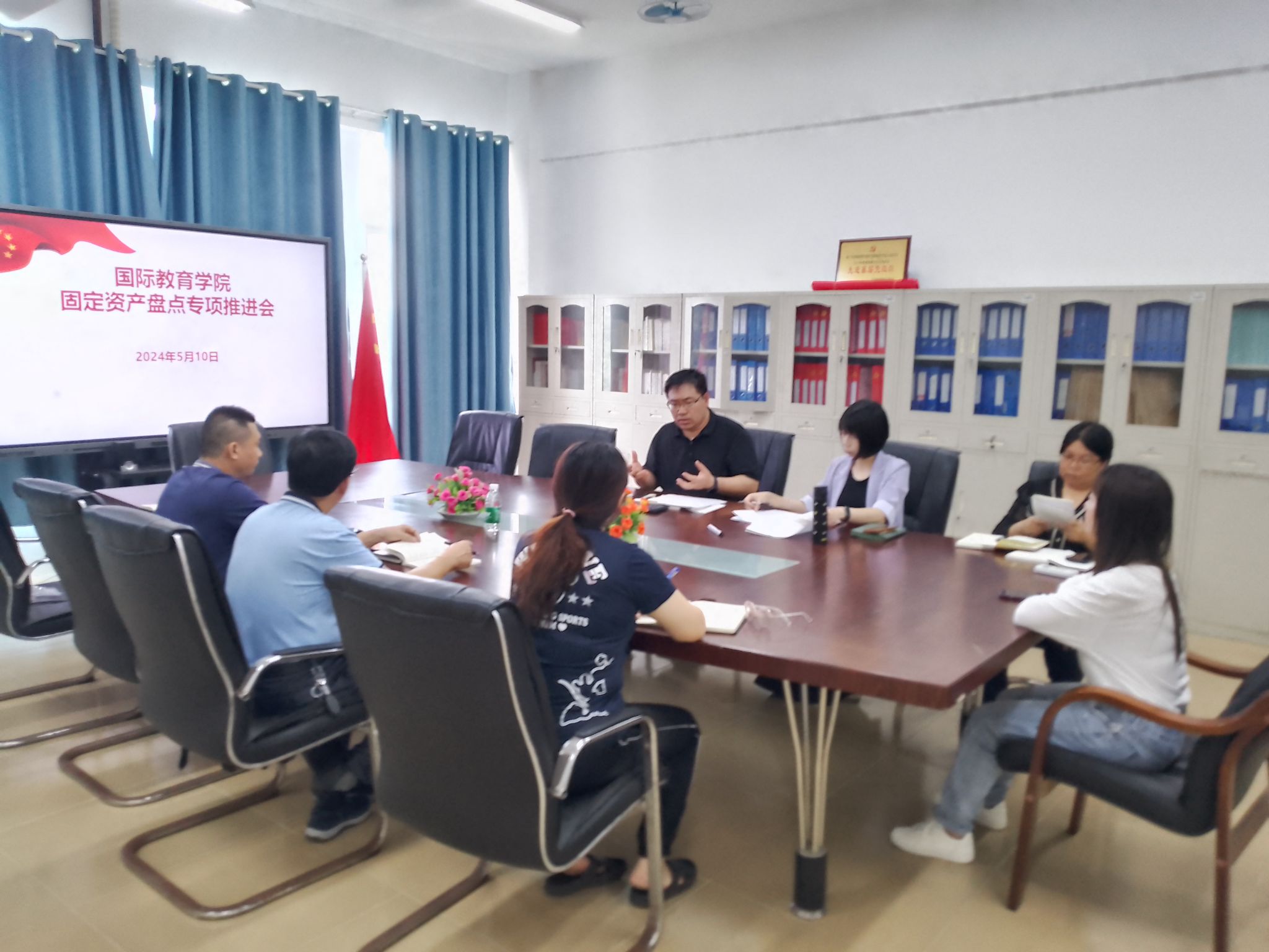 近日,国际教育学院为进一步加强资产管理,确保固定资产的准确性和完整性,召开了固定资产盘点专题推进会。会议由学院党总支书记于勇主持,黎瑛副院长、郑艳副书记、各相关办公室负责人参加了此次会议。