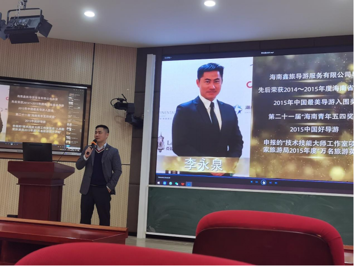 李老师参与接待过许多重要赛事与活动,例如世界小姐全球总决赛、博鳌亚洲论坛等。他用生动丰富的案例,幽默风趣的语言给同学们分享了在接待过程中的动人故事和心得体会。李老师通过自身的经历总结出实用的外语学习技巧---“learn language in use and don’t afraid of losing face”,并鼓励同学们考取英语导游证,做好职业规划。