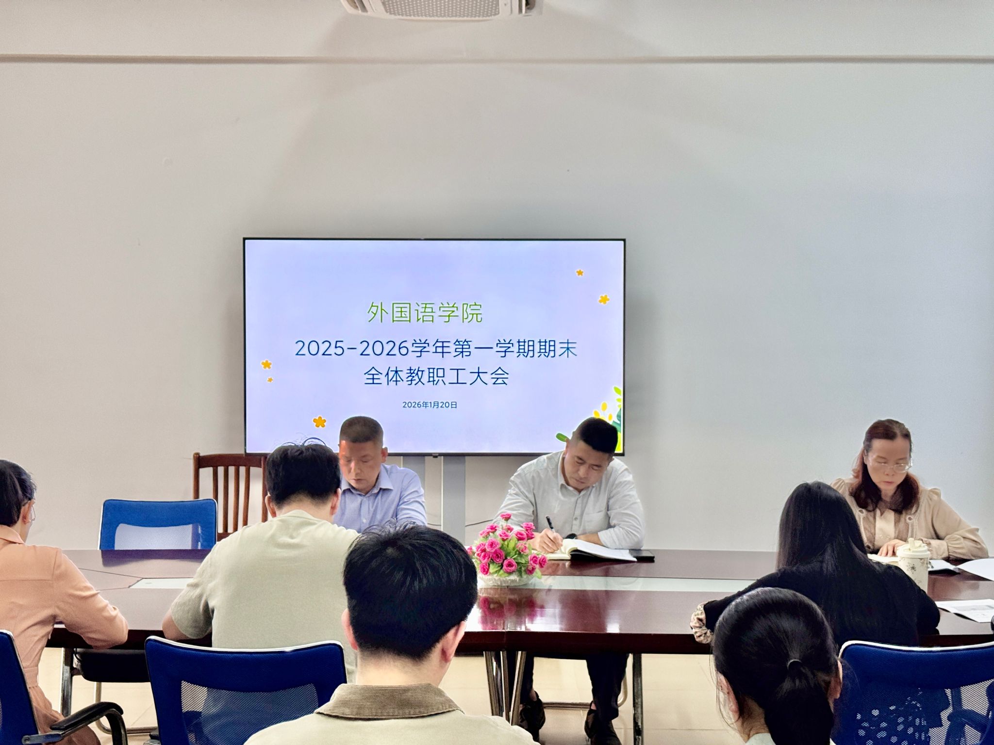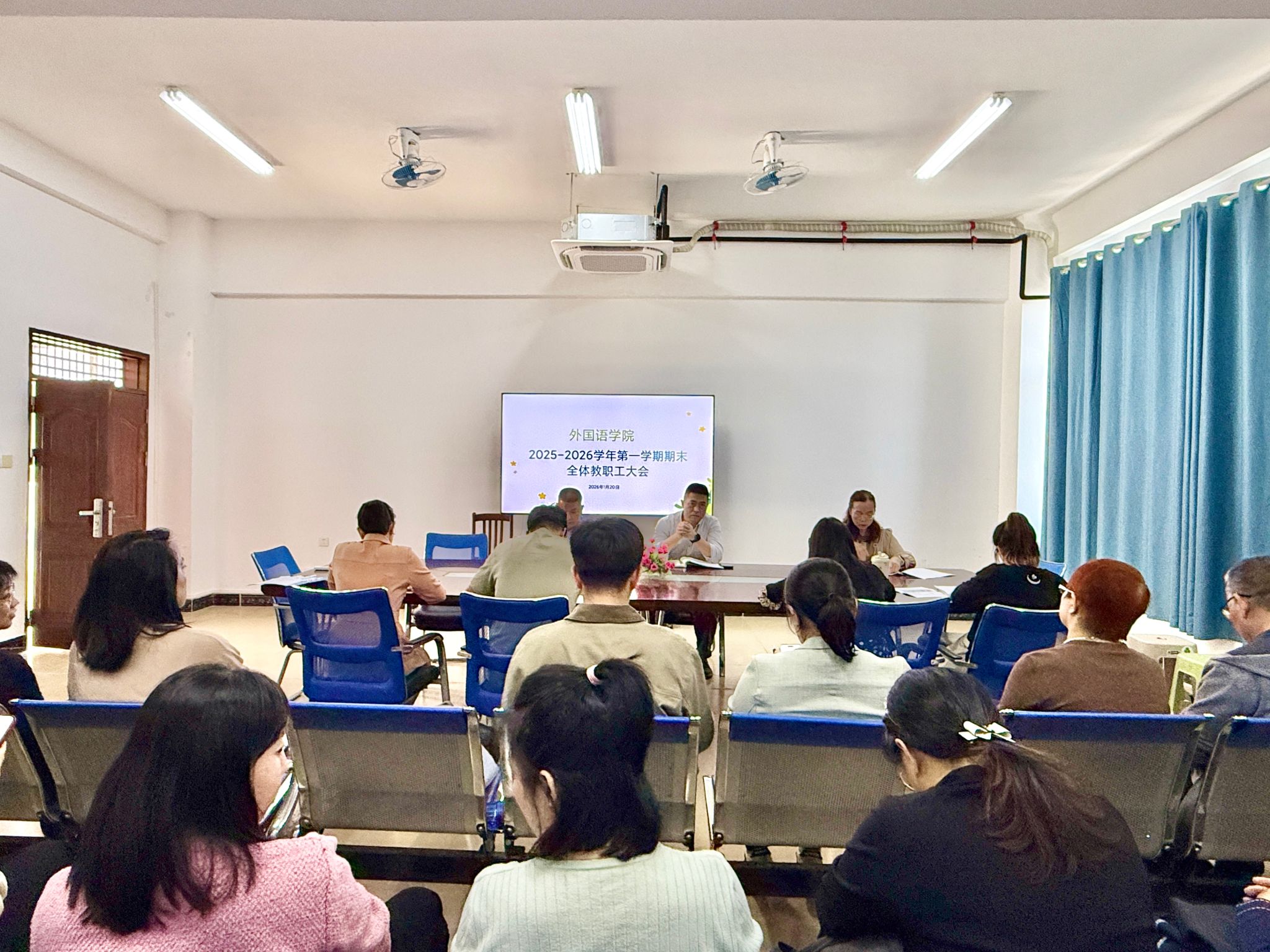 2026年1月20日,外国语学院顺利召开2025-2026学年第一学期期末全体教职工总结大会,学院党政领导班子成员及全体教职工参会。