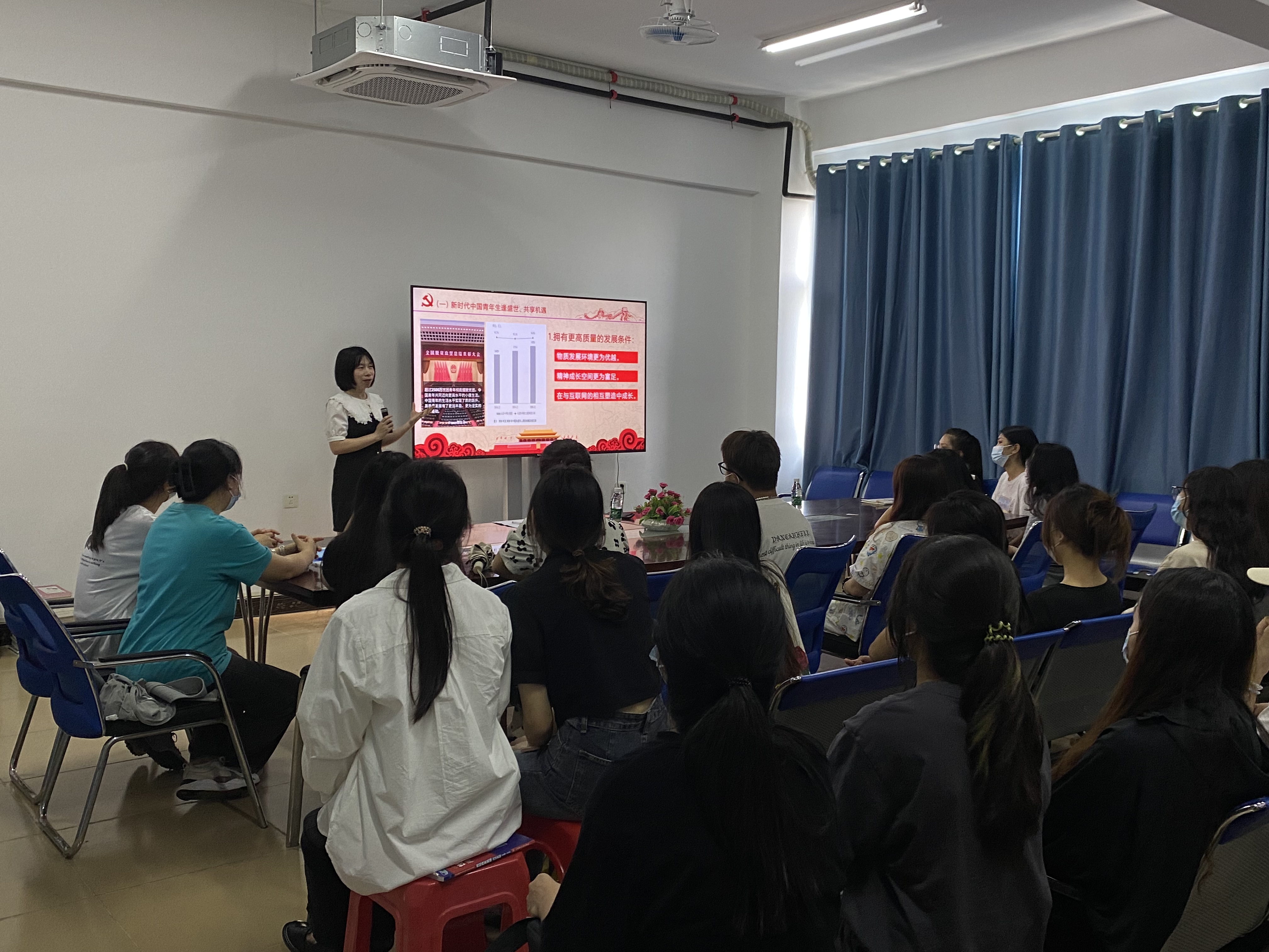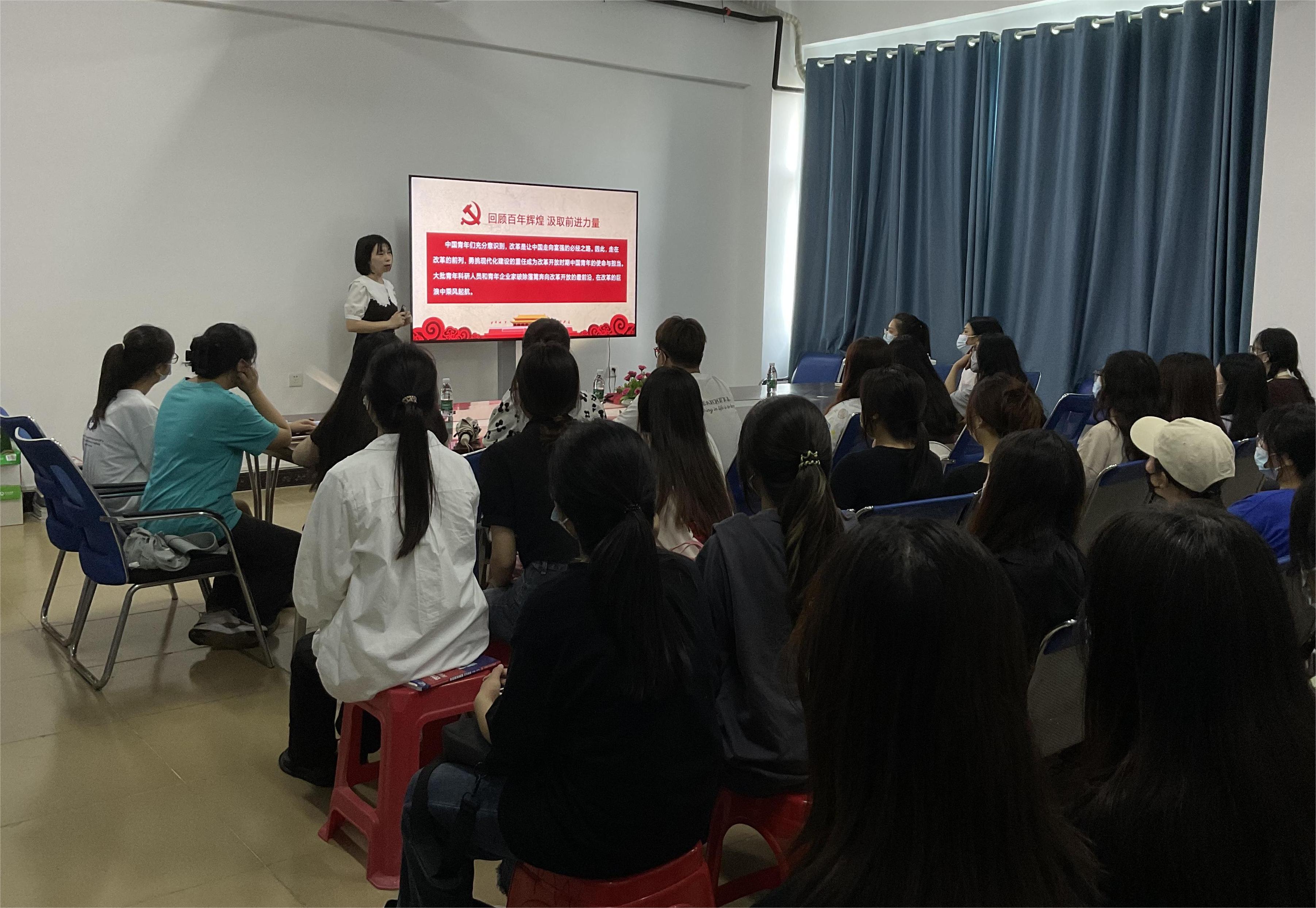 2023年5月5日下午,国际教育学院党总支副书记、学生党支部书记郑艳在5-411为党员和入党积极分子讲“汲取奋进力量 勇立青春之志”专题党课。学生党支部师生党员和入党积极分子60余人到场聆听。