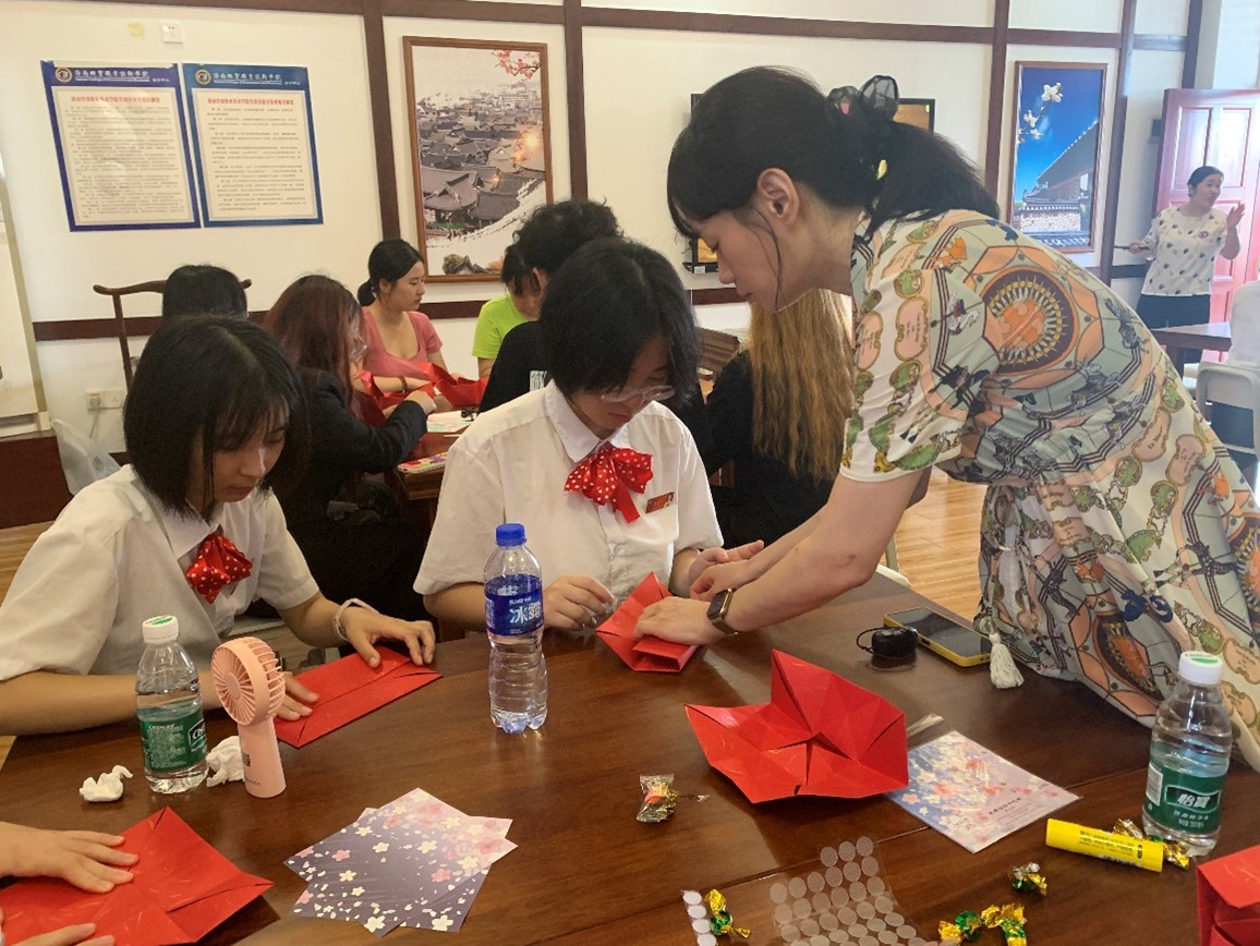 首先,韩语外教张智善老师为同学们讲解了用彩纸折韩服福袋的详细步骤,刘倩老师予以协助,同学们认真观摩聆听,积极动手尝试,在张老师和刘老师的指导下,同学们都折出了韩服形状的福袋,在此过程中,同学们既了解了韩国传统服饰的相关知识,又锻炼了动手能力。