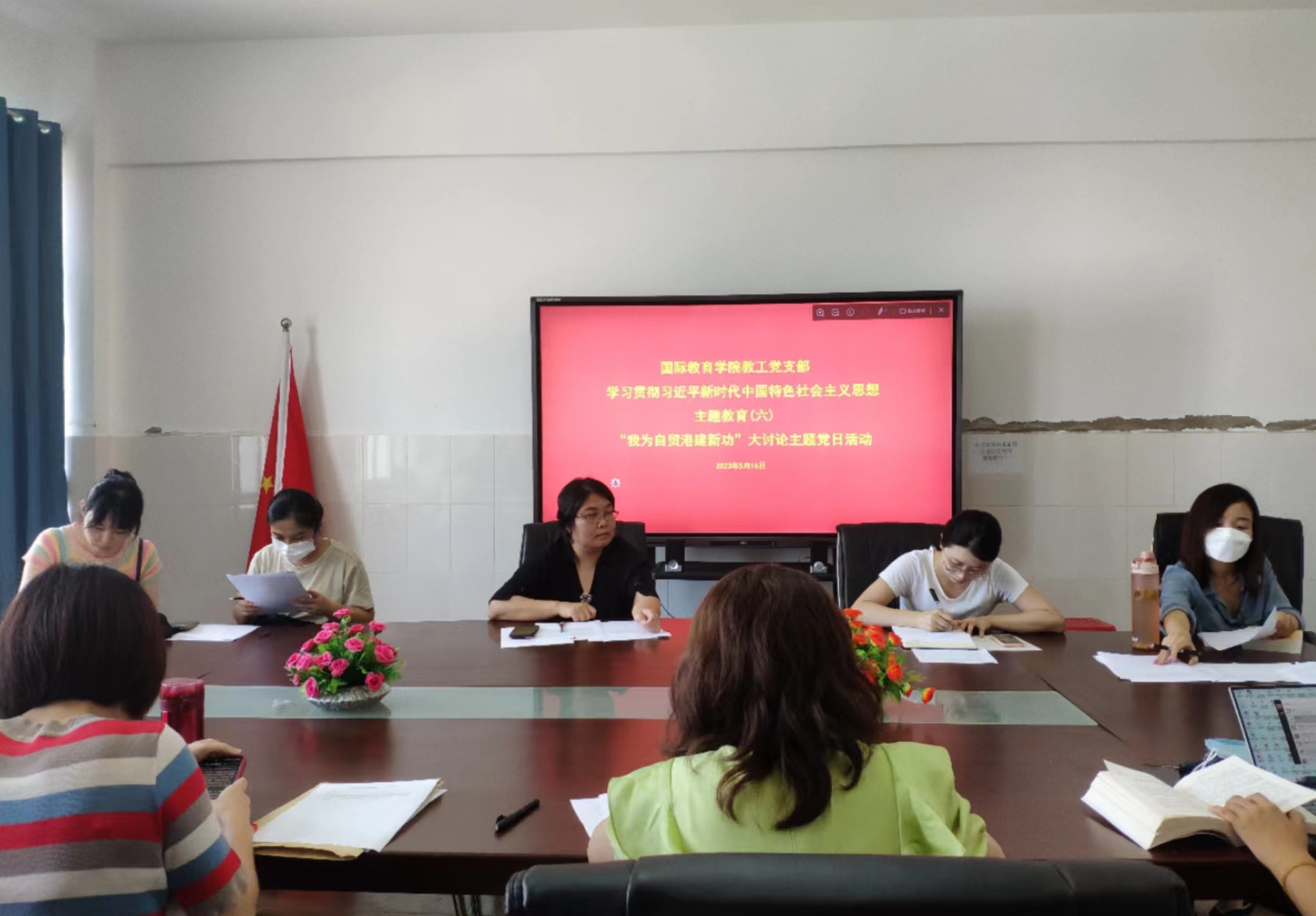 2023年5月16日下午,国际教育学院教工党支部开展了学习贯彻习近平新时代中国特色社会主义思想主题教育(六)“我为自贸港建新功”大讨论主题党日活动。会议由教工党支部书记黎瑛同志主持。