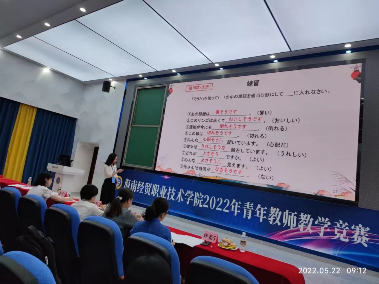 根据专家网络评审和校赛决赛,2138CC太阳集团2022年5月22日青年教师教学竞赛中,国际教育学院日语教师陈小苗紧扣教学目标,在竞赛中展现了海经贸青年教师扎实的教学基本功和深厚的学术素养,最终获得了校赛一等奖(文科)的好成绩,将于今年下半年代表我校,参加第十二届海南省高校青年教师教学大赛。