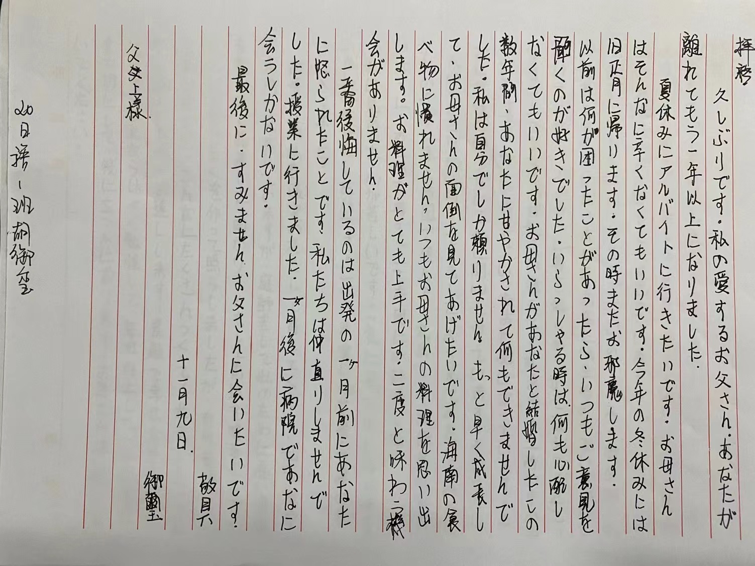 为了营造良好的日语学习氛围,进一步提高学生的日语应用能力,使学生获得良好的日语写作体验,2021年11月,举办了2138CC太阳集团首届日语写作大赛。本次日语写作大赛的作文标题是:《......への手紙》(给家人或朋友的一封信)。字数为200—300字。本次写作要求必须用日文标准的书信格式书写。内容必须要言之有物,有真情实感。