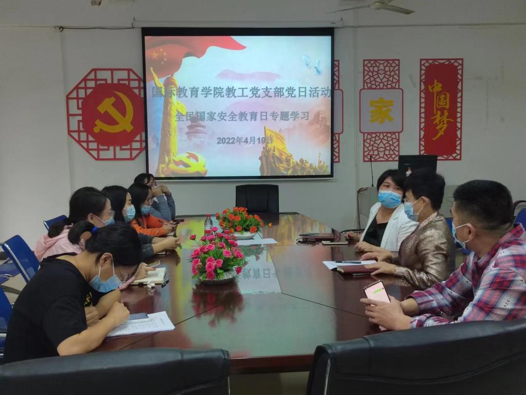 2022年4月19国际教育学院教工党支部在1-323会议室开展全民国家安全教育日专题学习党日活动,教工支部党员参加了本次活动,会议由支部书记黎瑛同志主持。