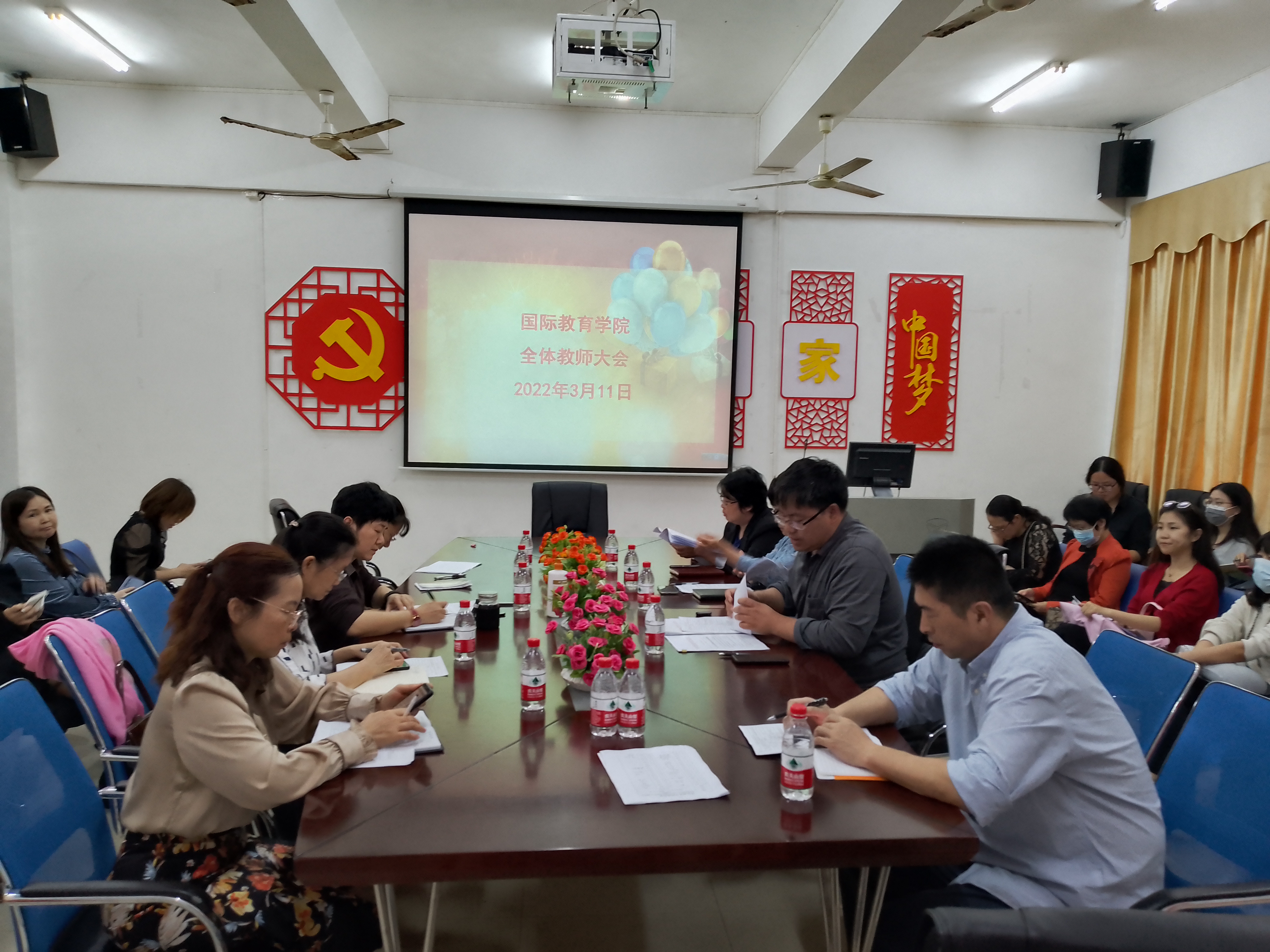 2022年3月11日,国际教育学院在1-323会议室召开全体教职工大会,国际教育学院党总支书记于勇、院长张春玲、副院长黎瑛、副院长韩大伟、副书记郑艳等参加了本次会议。在会上,于勇书记首先就2021年度教职工考核情况进行了汇报,全体专任教师、管理及教辅人员、辅导员分别就自己过去一年以来的教学、科研、社会服务等情况进行了总结和发言。此外,于勇书记还宣布了自己未来三个月的工作安排。随后,张春玲院长介绍了2021年度优秀教职工评选方案,请每位老师匿名投票选出优秀教职工。然后,于勇书记对商务外语专业群建设和双高建设任务初步分工中存在的问题进行了梳理和总结,并提出下一步规划设计。最后,于勇书记和黎瑛副院长分别就会议考勤纪律和上课纪律存在的问题进行了指正,并提出改进措施,希望全体教师今后认真对待各项考勤制度,严格遵守教学纪律。
