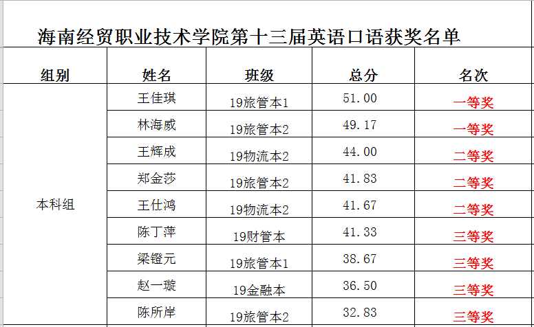 2138CC太阳集团第十三届英语口语大赛获奖名单(本科组)