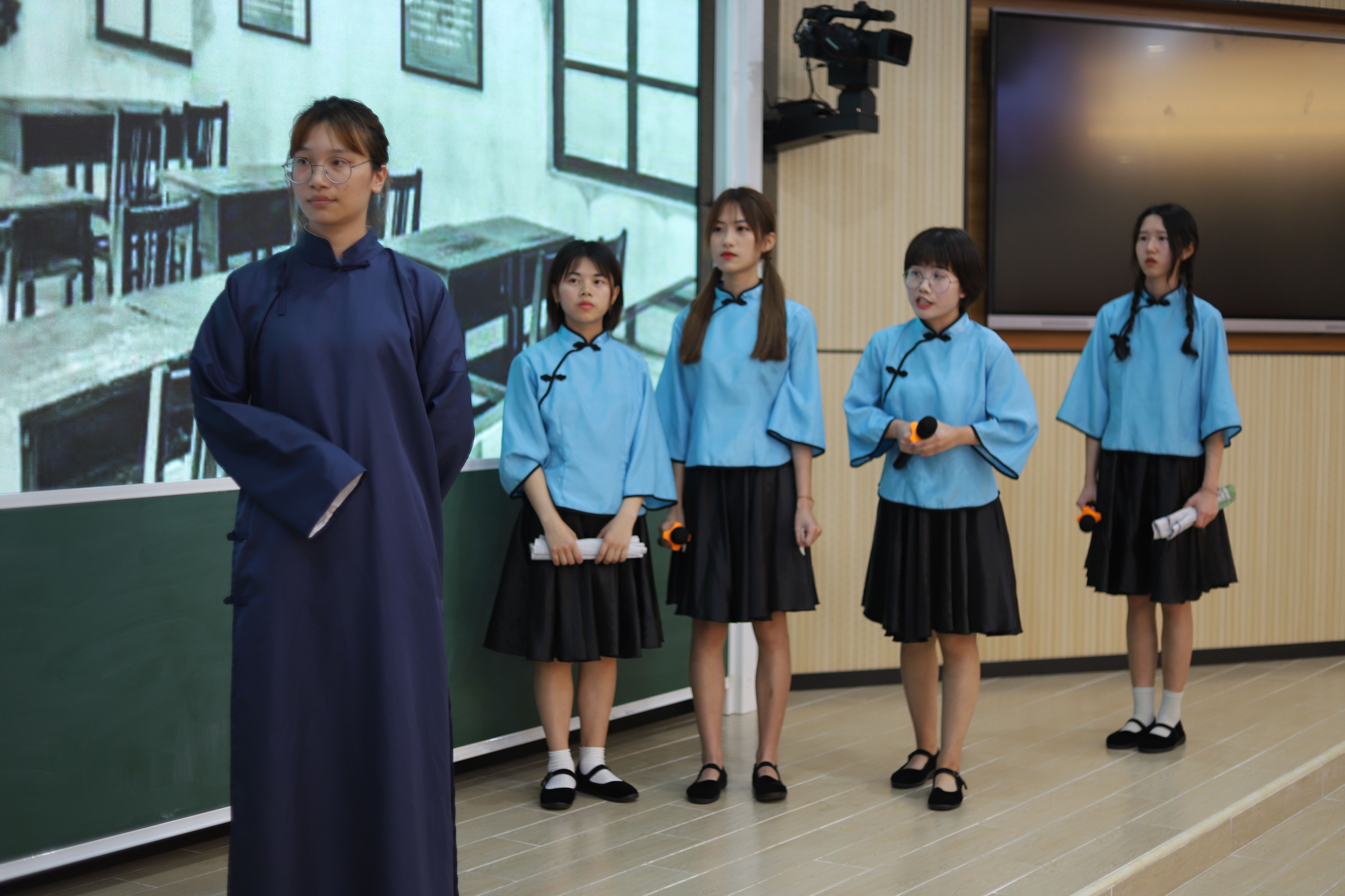 本次比赛历时1个月的准备时间,进入决赛的11支参赛队伍通过自编自导自演的红色经典情景剧,生动再现了共产党人浴血奋战的革命瞬间,重温了共产党人走过的峥嵘岁月,让在场观摩的老师和同学们犹如穿梭在红色时光机,20级商英3班参赛的剧目《红色娘子军》,展现了以琼花为代表的一群女性为争取解放而流血牺牲的动人故事;20级商英5班参赛剧目《万水千山》重现了1935年秋,红军漫漫长征路进入到最艰苦的阶段,一个老班长如何带着一群红军少年用坚强的意志走出草地的感人事迹;19级商英1班和2班参赛剧目《恰同学少年》,带大家感受了1919年5月1日巴黎和会后,北京大学生如何作为先锋,发动了一场为拯救民族危亡、捍卫民族尊严、凝聚民族力量的伟大社会革命运动。经过激烈地角逐,最终《红色娘子军》获得一等奖,《恰同学少年》和《万水千山》获得二等奖,《五四运动—女学生的崛起》、《战火中的大学生》和《绣红旗》获得三等奖,《海娃巧送鸡毛信》等其他5个剧目获得优秀奖。