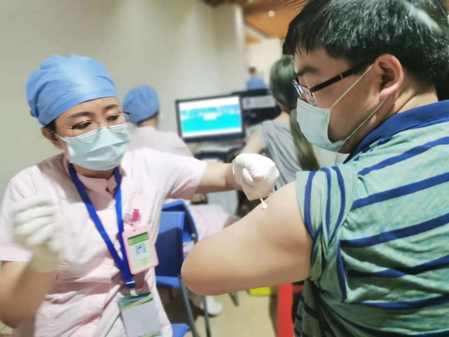 国际教育学院党总支书记于勇前往校图书馆疫苗接种现场,关心同学们的疫苗接种情况,并带头接种。国际教育学院中外师生积极踊跃地响应号召,早早地到图书馆门口排队,接种。疫苗接种现场,同学们穿着宽松衣服,佩戴口罩,携带相关证件有序排队,并听从工作人员的指挥,很好地配合了志愿者以及医护人员的工作,保证接种疫苗顺利进行,现场各个环节有条不紊地推进。尼泊尔的留学生们为能够在学校免费接种新冠疫苗对我们的国家表示感谢,因为在他们的国家新冠疫苗接种不是免费的,也不是人人都可以享受到的福利,他们很开心可以留在中国学习和生活。