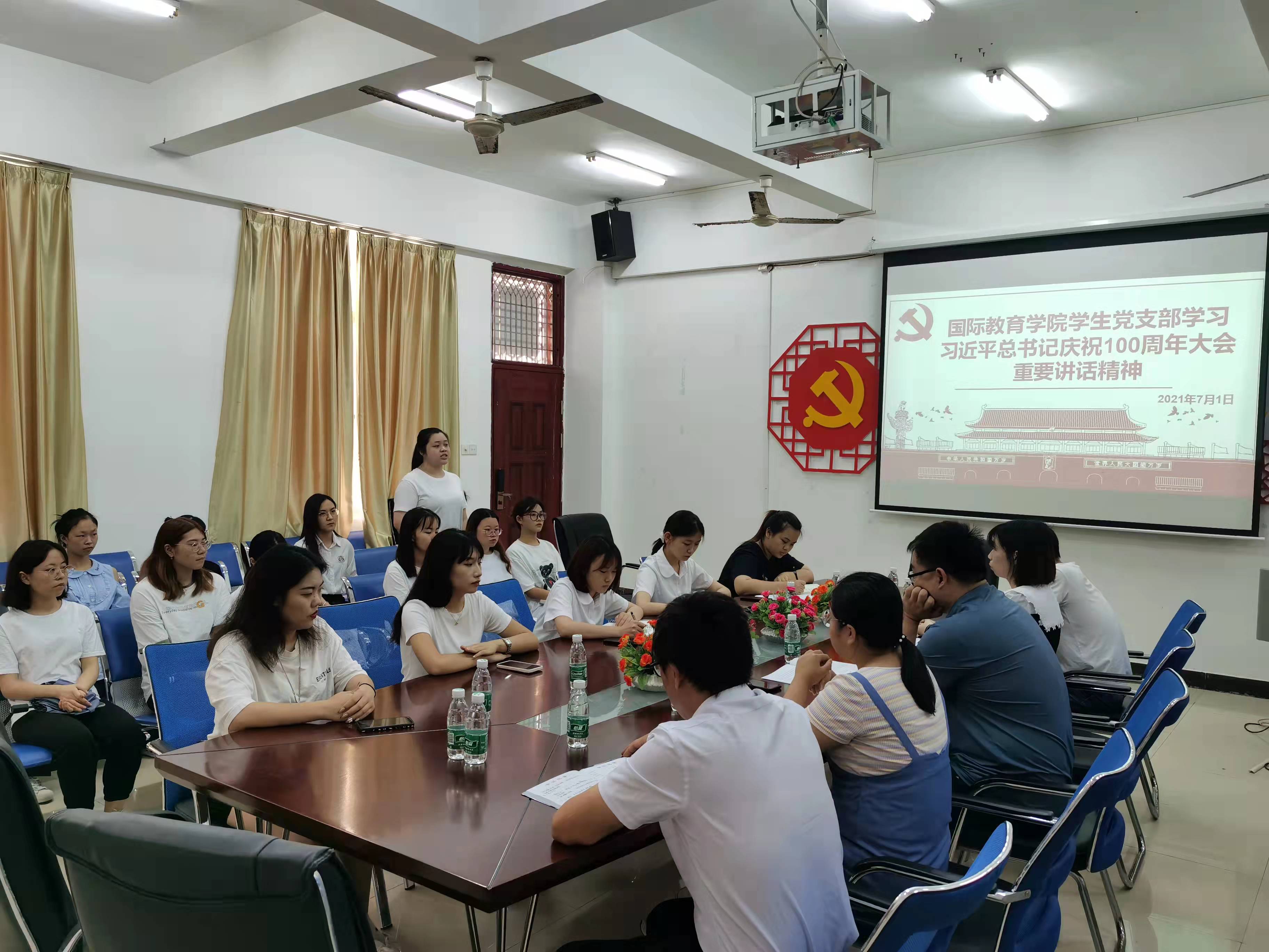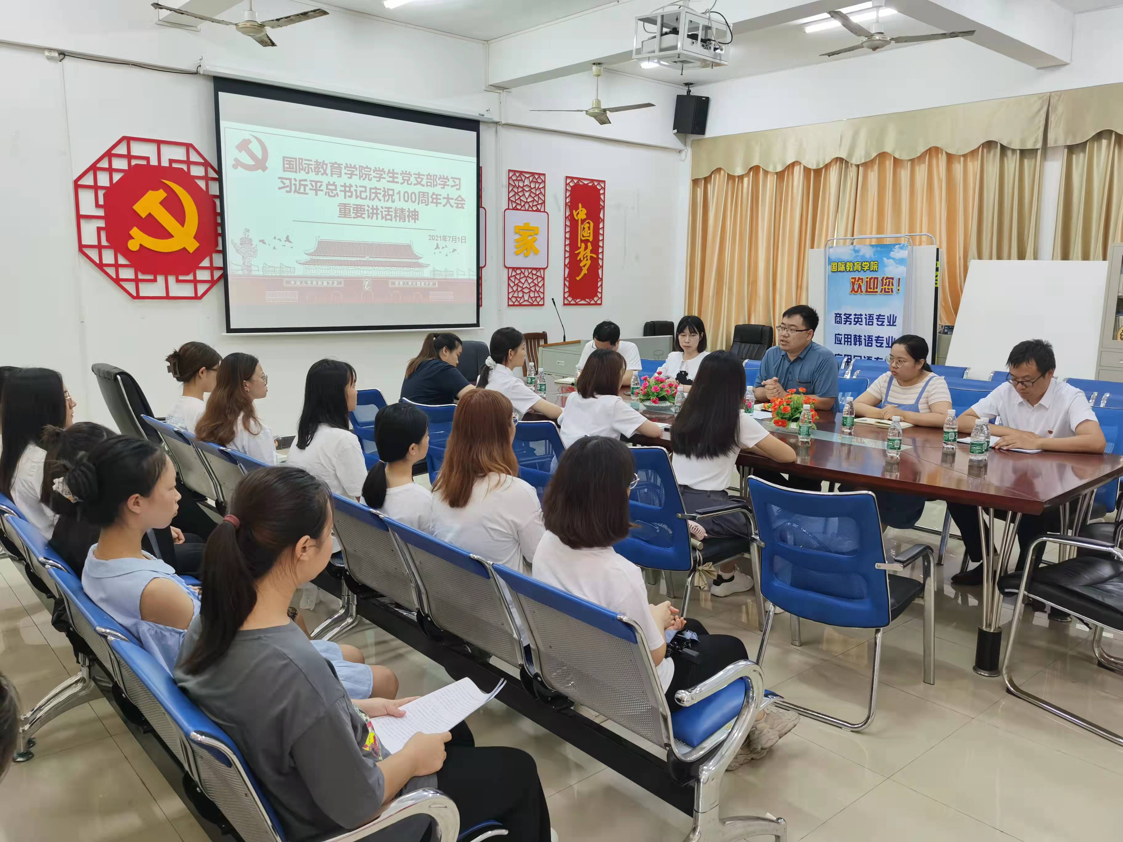 2021年7月1日8时,庆祝中国共产党成立100周年大会在北京天安门广场隆重举行。习近平总书记在天安门广场发表了重要讲话,为了深入学习习近平总书记在庆祝中国共产党成立100周年大会上的重要讲话精神,国际教育学院学生党支部在1-323会议室召开了座谈会。