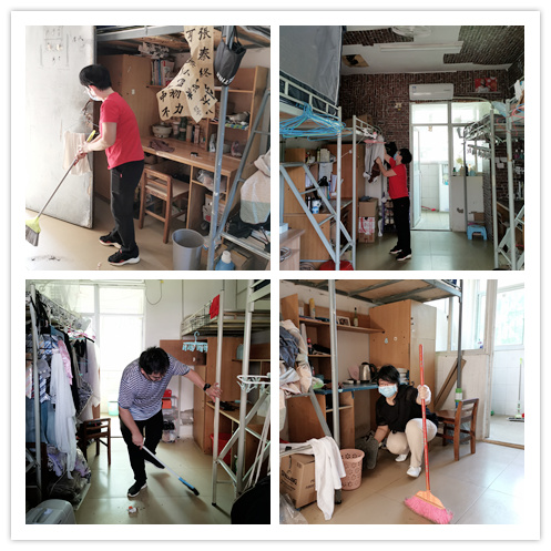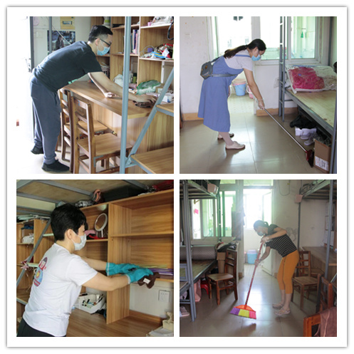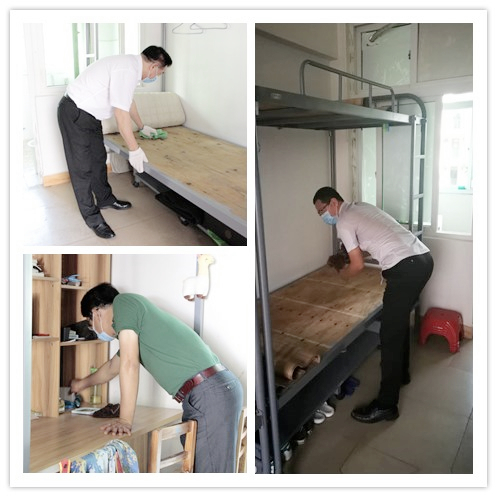 开窗通风透气,整理归置物品,扫地抹桌子、清扫垃圾……在36℃的高温天气下,领导和老师们撸起袖子,有的在擦洗漱台,有的在拖地,有的在清理垃圾,干得热火朝天、汗流浃背。清理过后,全院一百多间宿舍的书桌物品摆放整整齐齐,床、柜、桌、椅和地面都被擦拭得干干净净,发霉变质的食物、空饮料瓶等垃圾被清理丢弃。