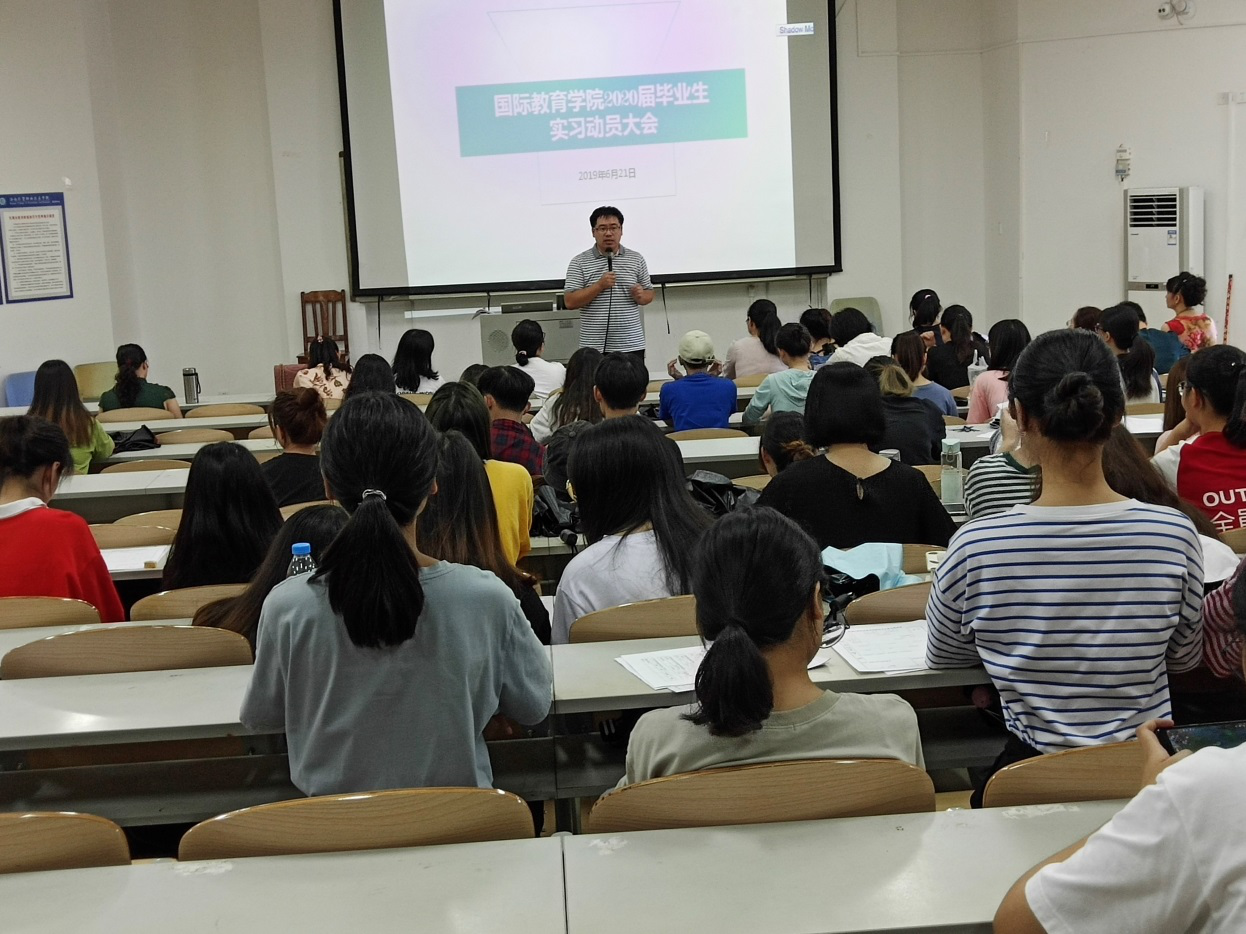 6月21日,国际教育学院召开2020届毕业生实习动员大会。学院院长张春玲、党总支副书记于勇、教学副院长黎瑛、学工办、教务办及全体2020届毕业生到场参加。